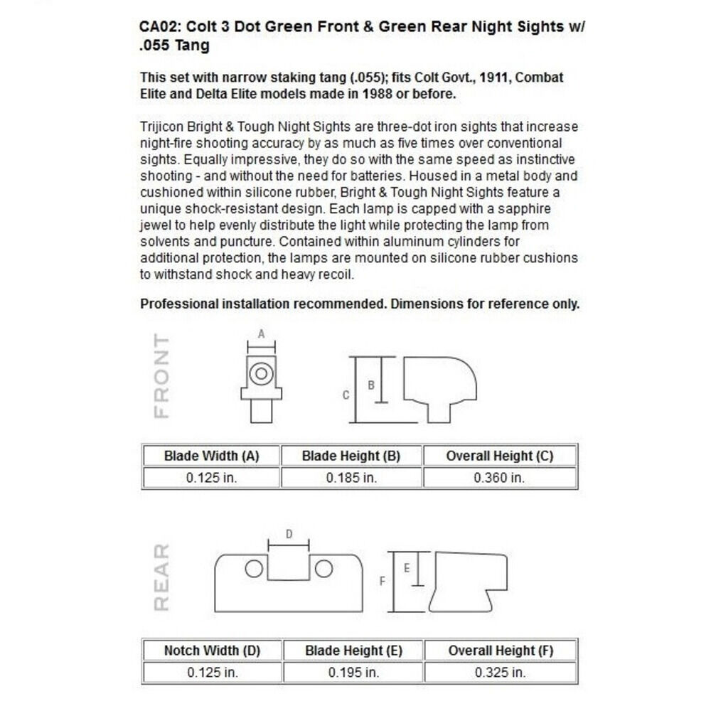 Colt Govt 1911, Combat Elite, Delta Elite Modelle in/vor 1988 gebaute Pistolen, Nacht Visierset 3-Dot grün selbstleuchtend, Stake on Visierkorn .055"/1,4mm Tang. Trijicon, USA. Nacharbeiten sind eventuell erforderlich - eine fachgerechte Montage wird empfohlen.