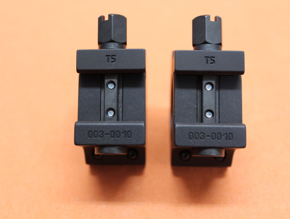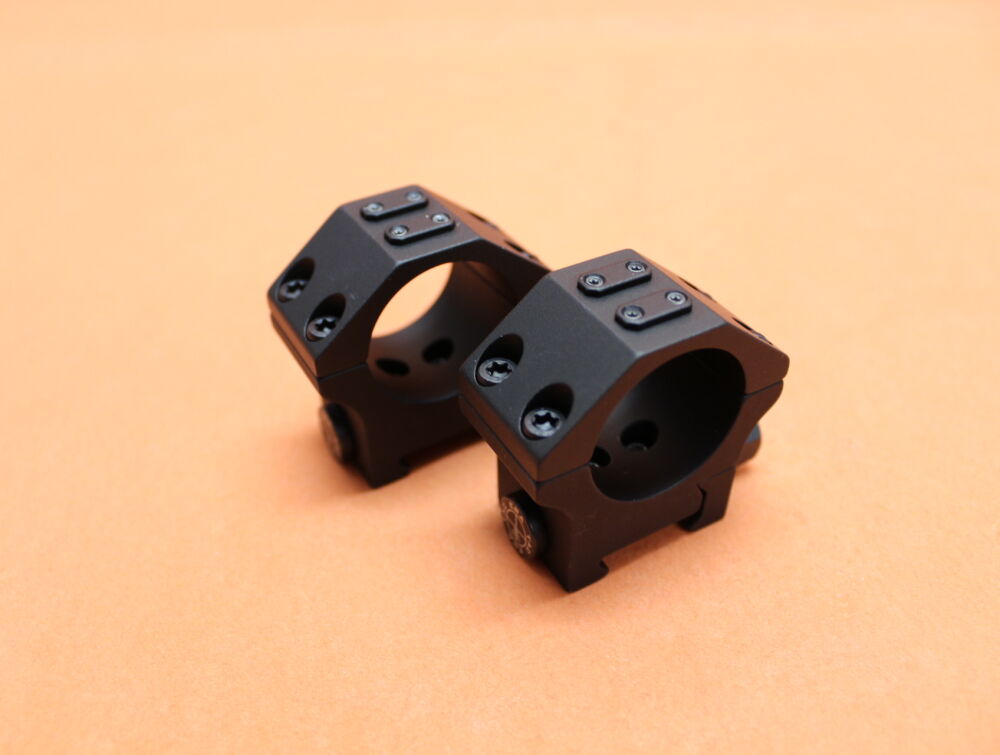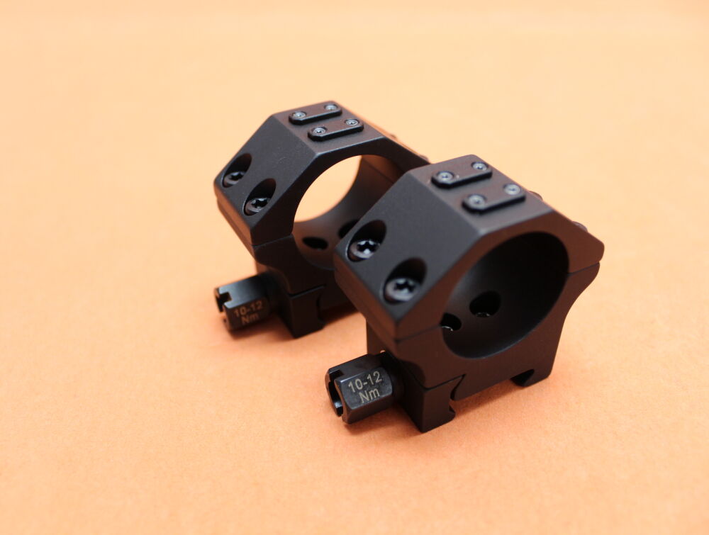 Zweiteilige Ringmontagen aus hochfestem Aluminium und harteloxiert nach Mil-Spec. Typ III Mattschwarz. Sie sind verfügbar als schnell abnehmbare Version mit Sicherheitshebeln oder aber mit Sechskantmuttern; erstere machen den Einsatz von Werkzeugen überflüssig. Durch ihre Einstellbarkeit lassen sich die Hebel problemlos auf außerhalb der Norm liegende Picatinny-Schienen einstellen. Die Sicherheitshebel werden aus Stahl hergestellt und sind rostfrei und gehärtet. Jeder 25 mm breite Ring ist mit unserer UNIVERSAL-Schnittstelle ausgestattet. Lieferbar mit Ringen im Durchmesser 30 mm und 34 mm in diversen Bauhöhen. Der Durchmesser 1“ wird durch Reduzierringe erreicht.