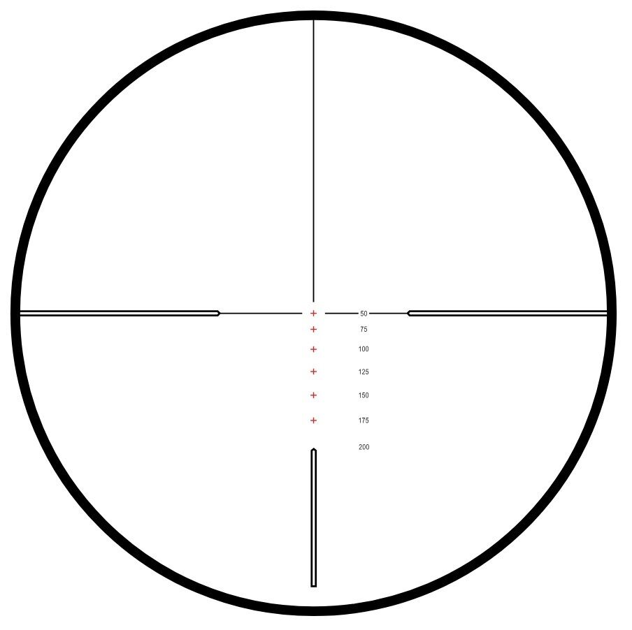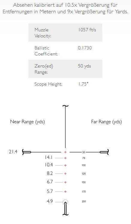 Für das .22 LR Subsonic Kaliber konzipiert. Bei 10.5x Vergrößerung einschießen für 50m Nulllage. Alle weiteren Haltepunke ergeben sich von alleine (322m/s).