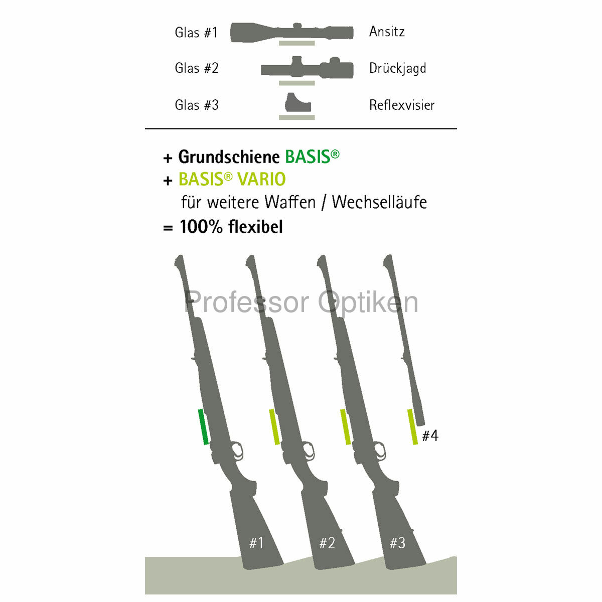 Alle Zieloptiken von Professor Optiken sind optional auch mit dem DENTLER Montagesystem verfügbar. Das zweiteilige System besteht aus einer Grundschiene BASIS für die Waffe und einer Montageschiene BASIS für die jeweilige Optik. Das zweiteilige System verbindet Zieloptik und Waffe sicher und mit 100 %iger Reproduzierbarkeit. Einmalig eingestellt, verriegelt die Montageschiene immer mit dem gleichen Drehmoment und spielfrei auf der Grundschiene. Ein weiterer Vorteil des Montagesystems ist, dass mehrere Zieloptiken einfach und sicher auf der Waffe genutzt werden können. Mit der Grundschiene BASIS VARIO können verschiedene Zieloptiken zudem auf verschiedenen Waffen montiert werden.