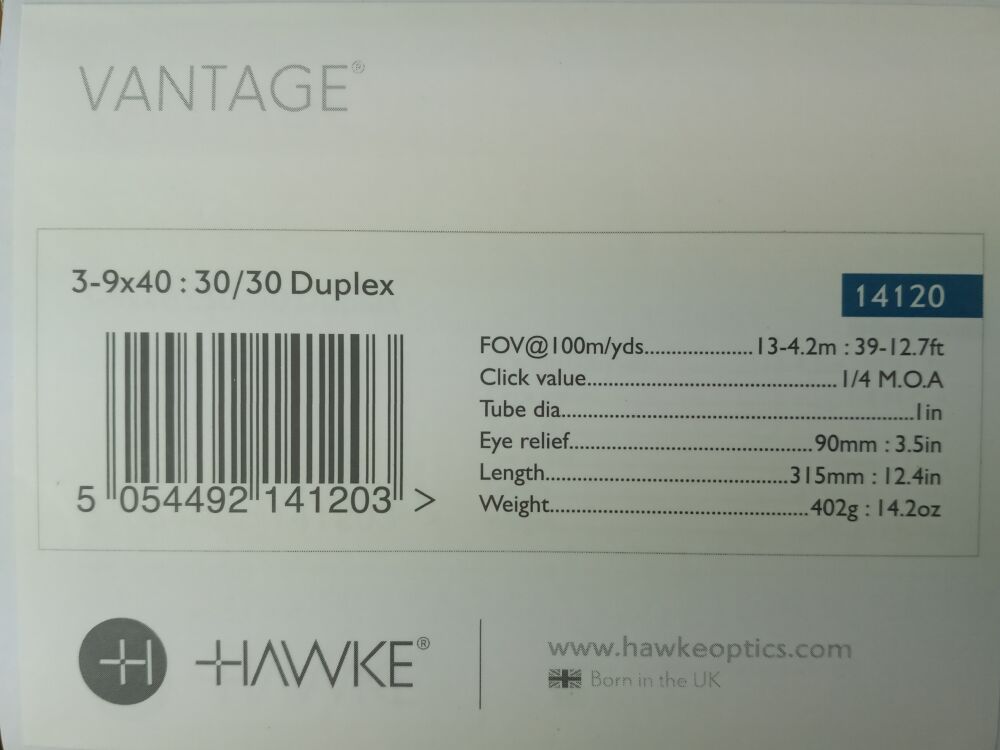 Zielfernrohr Hawke Vantage 3 - 9 X 40 Duplex Absehen Mittelrohrdurchmesser 25,4 mm Gesamtlänge 307 mm Sichtfeld 13 - 4,2m auf 100Meter ...weiterlesen