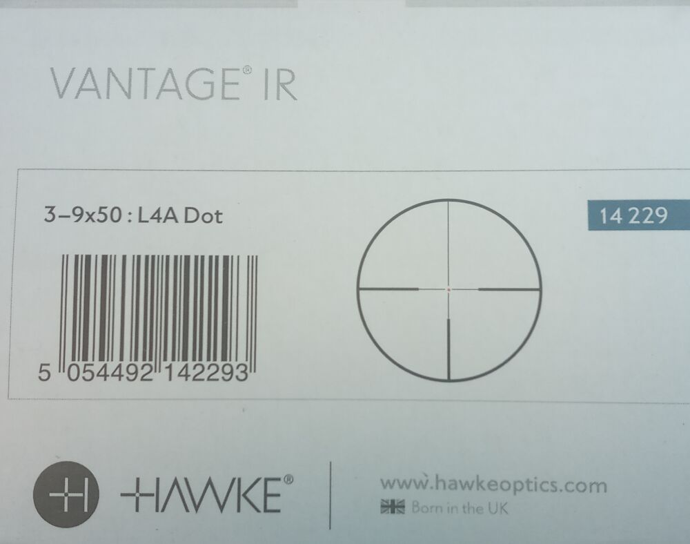 Zielfernrohr Hawke Vantage IR 3 - 9 X 50 L4A DOT Absehen beleuchtet mit 5 Helligkeitsstufen Rot/Grün Mittelrohrdurchmesser 25,4 mm Gesamtlänge 343 mm Sichtfeld 11,2 - 3,7m auf 100Meter ...weiterlesen