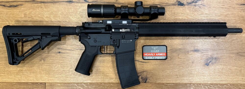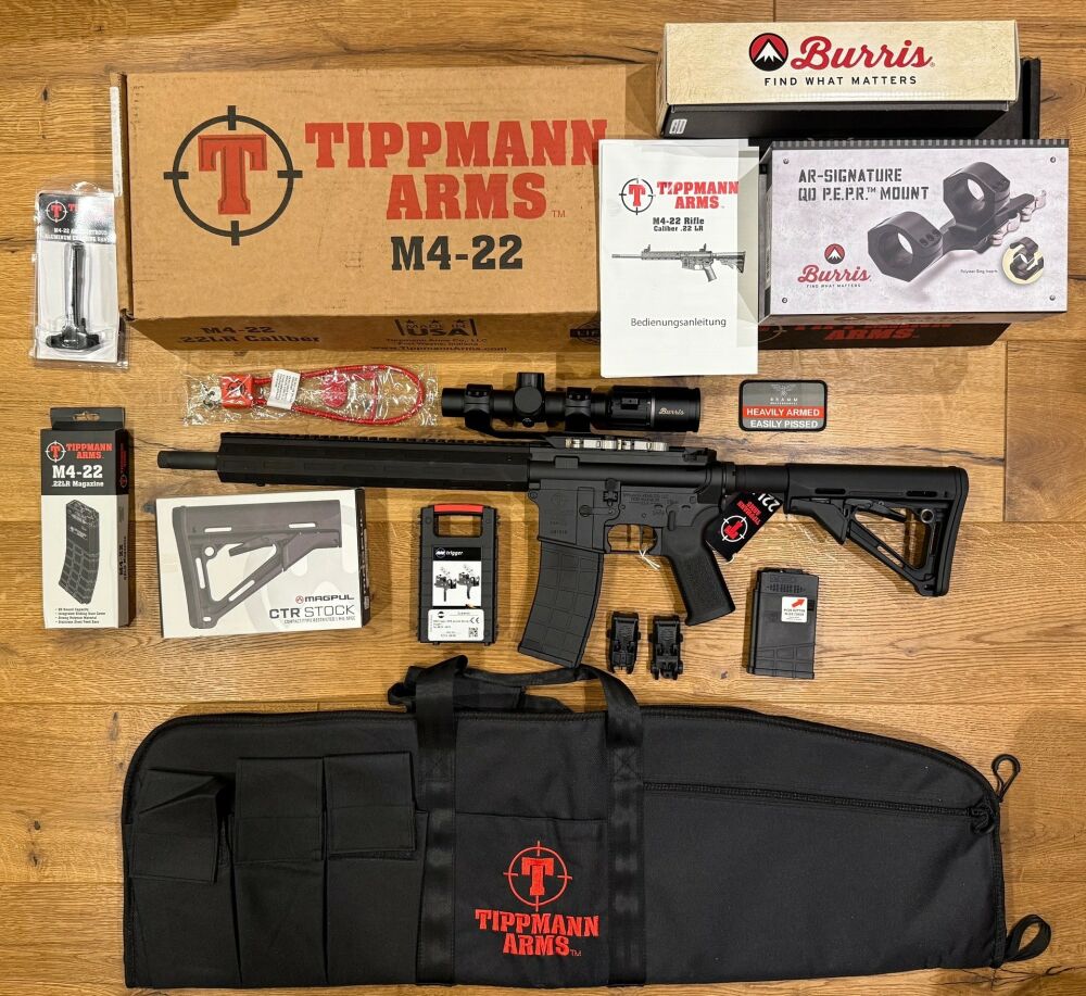 Lieferumfang: Waffe, Burris LPVO 1-6, ZF- Montage, Alu Ladegriff, Magpul Schaft, MAK Abzug, 1x Magazin 25 Schuss, 1 Magazin für 10 Patronen, Bedienungsanleitung, Tragetasche, BIUS