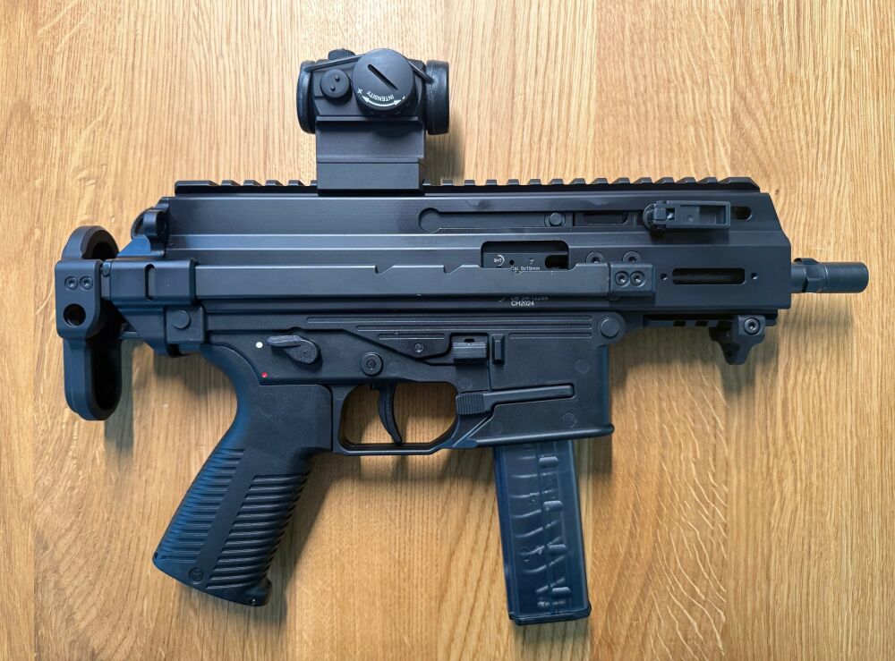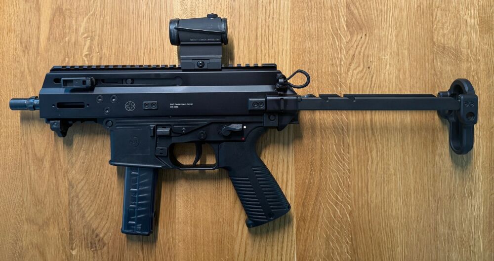 Kal. 9x19mm, Lauflänge 138mm - Aimpoint® Micro T-1, klappbares Notvisier - beidseitiger, klappbarer, nicht mitlaufender Ladehebel - Teleskopschaft - 3-Lug Schalldämpferanschluss - 3x Magazine 15/30 Schuss - Vordergriff, Putzzeug, Tragriemen, Koffer & Manual
