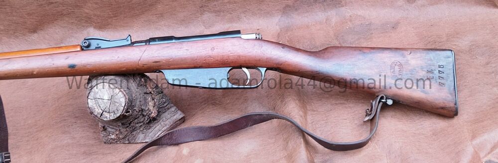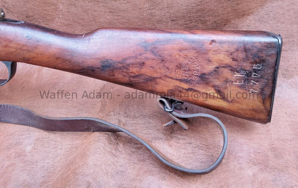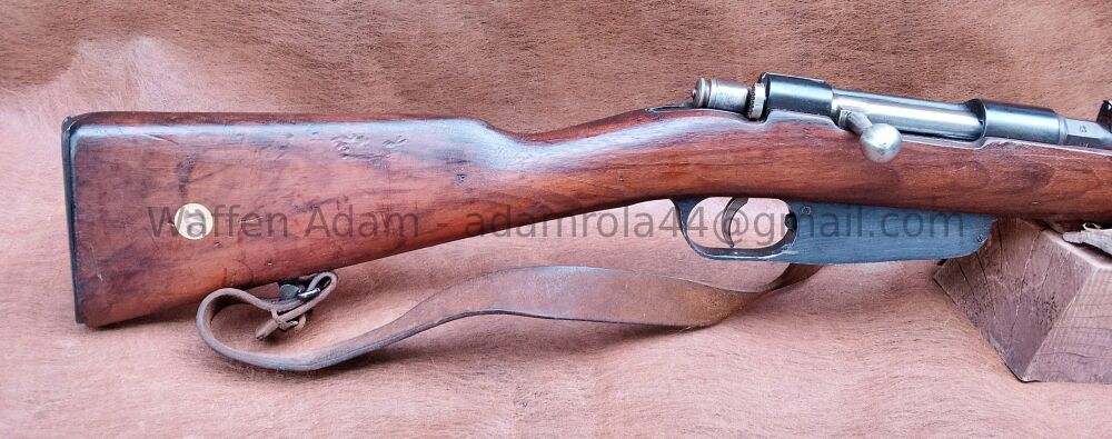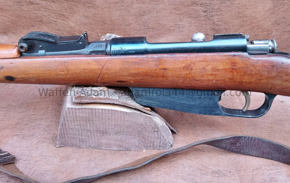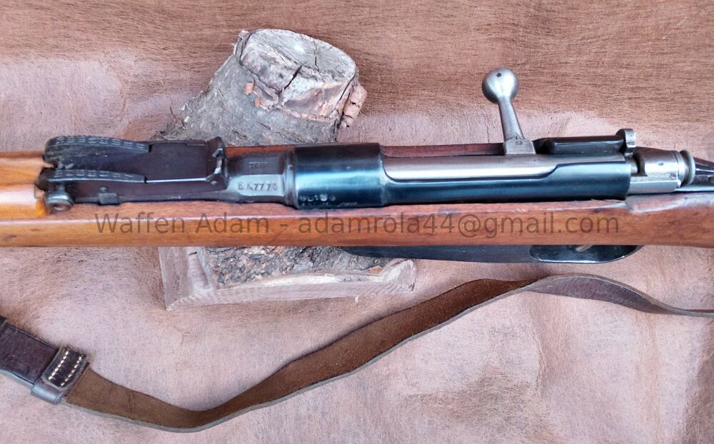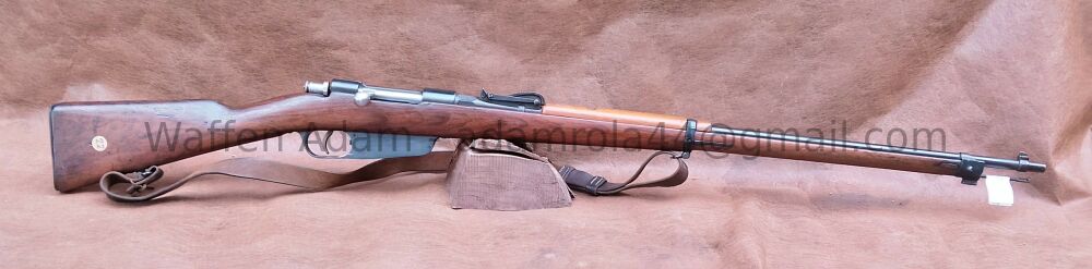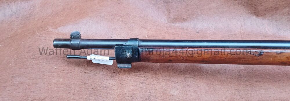 gültiger Beschuss. Tangential Visier V-kimme, Dachkorn. original Putzstock, Kastenmagazin für Lade-Streifen, Stahlschafkappe, Original Gewehrriemen, Lauf leicht matt jedoch gutes Zug Feld Profil. Insgesamt schöner Zustand.