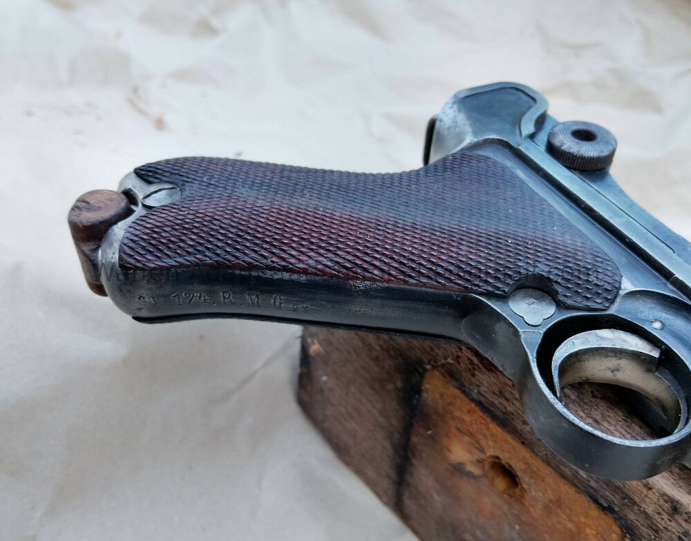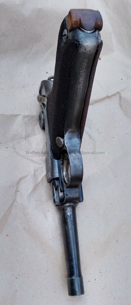 Pistole 08 Erfurt, frühe Fertigung : 1912, noch ohne Kupplungsleiste am Griffstück, nummerngleich, Lauf blank, spiegelt! Nickel Falzmagazin nicht ngl. Partielle Närbchen, Truppenstempel !! (10. Loth... ...weiterlesen