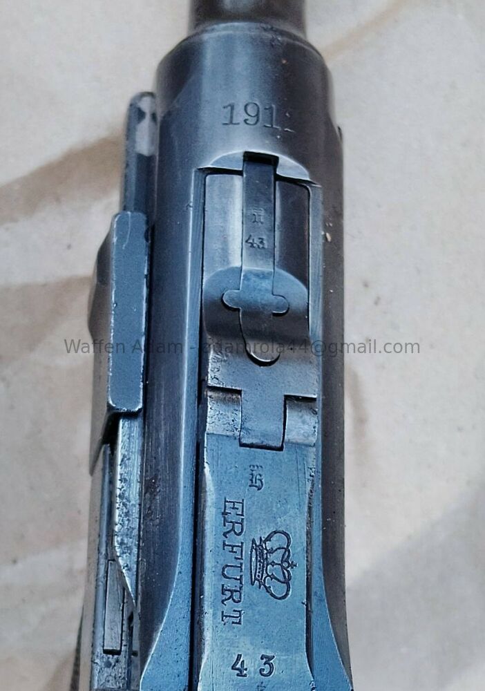 Pistole 08 Erfurt, frühe Fertigung : 1912, noch ohne Kupplungsleiste am Griffstück, nummerngleich, Lauf blank, spiegelt! Nickel Falzmagazin nicht ngl.