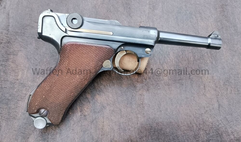 Mauser Pistole 08, noch frühe Mauser Fertigung, ohne "Mauserbacke" mit Codierung S/42 am Vordergrlenk, Hülse mit Datierung 1936.