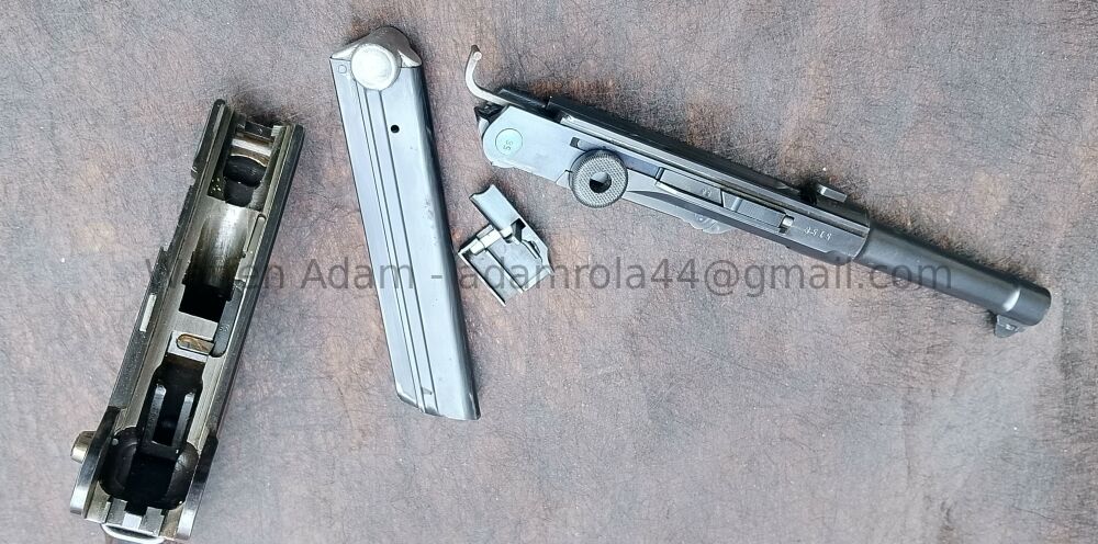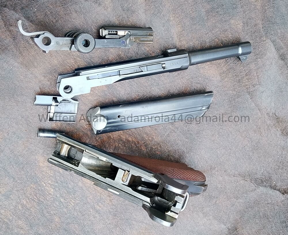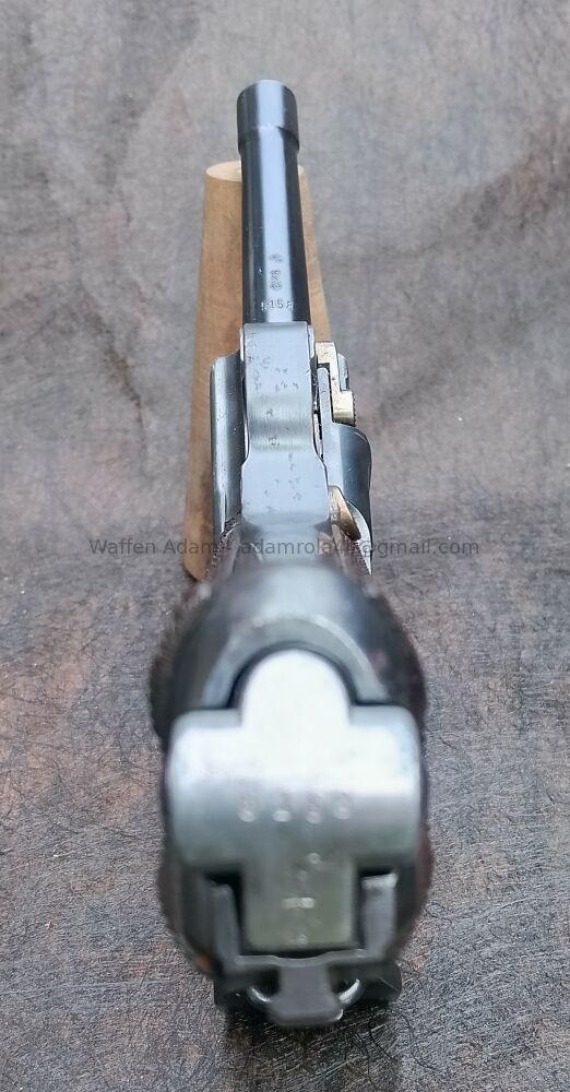 Nummerngleich inklusive Magazin, Schlagbolzen, Griffschalen und Gelenkbolzen,korrektes nummerngleiches Magazin mit Alu Bodenstück. Dachkorn und V- Kimme. Brünierung 98%, gelb angelassene Funktionsteile, sehr gut erhaltene Griffschalen. 0hne jegliche Fremdstempel bis auf verdeckten gültigen Beschuss . Lauf Zustand gut bis sehr gut. Geringe matte Stellen in den Zügen.