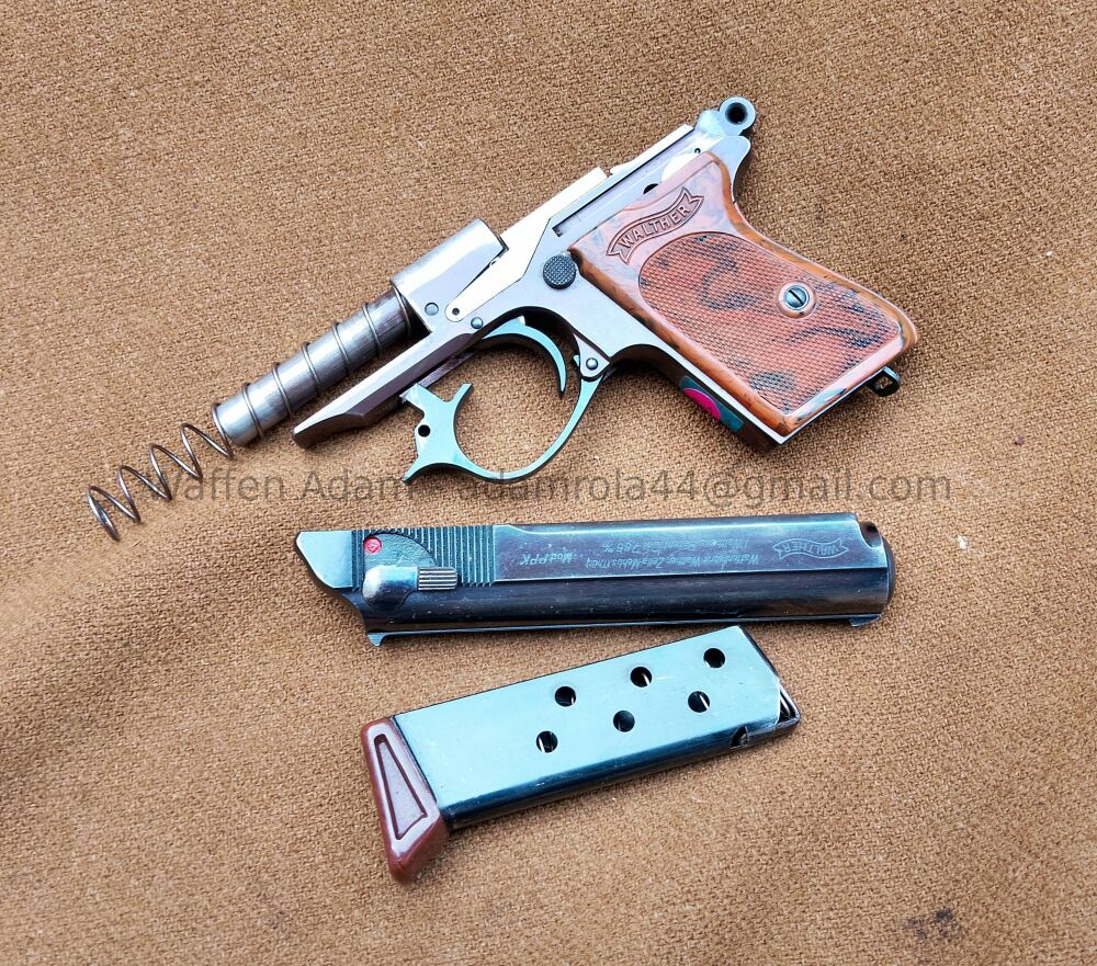 Frühe Walther PPk, mit 90° Sicherung , ca. 1932 (?) schöner , gebrauchter Zustand. Lauf spiegelt. Gültiger "Krone N" Beschuss. Einteilige Griffschale, Magazin mit Walter Schlaufe und Verl... ...weiterlesen