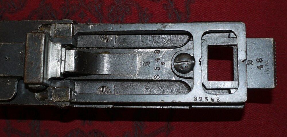 Original MG08 DWM Gehäusedeckel in leicht bis gut gebrauchtem Arsenalzustand. Komplett mit allen Visierteilen und Federn. Vereinzelt ist einer der Verschluss-Niederdrücker-Blattfedern (unten am De... ...weiterlesen