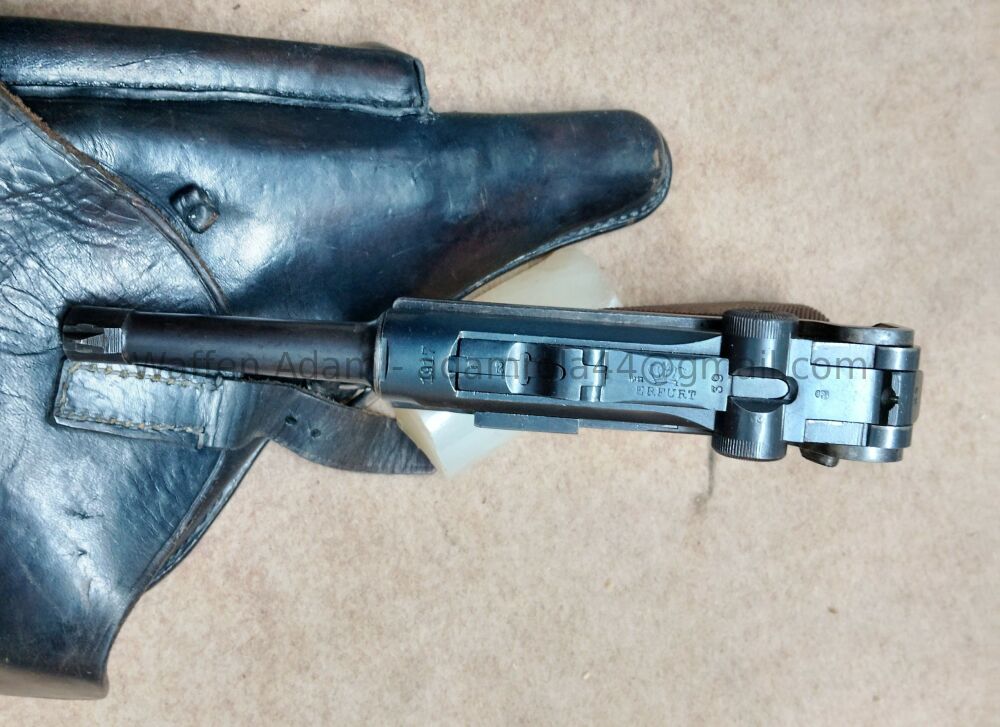 Erfurt P.08, sehr schöner Zustand, Lauf blank, inclusive Tasche, diese ungestempelt (Offiziersbeschaffung!?) , nummerngleiches, sehr gutes Magazin, makellose Nussholz Griffschalen mit sauberer Fischhaut, Waffe ohne Fremdstempel daher ohne gültigen Beschuss.