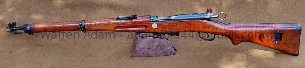 Karabiner K11 der Streitkräfte Schweiz, Schmidt Rubin Geradezug System mit vorne liegenden Verriegelungswarzen. Sehr schöne Erhaltung mit spiegelndem Lauf. Original Mündungsschoner. Sammlerwaffe und Sportwaffe , gültiger Beschuss 2/25