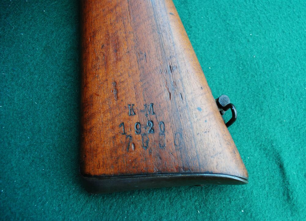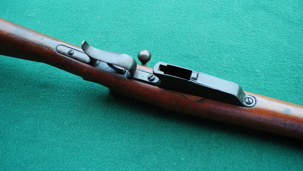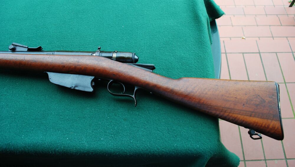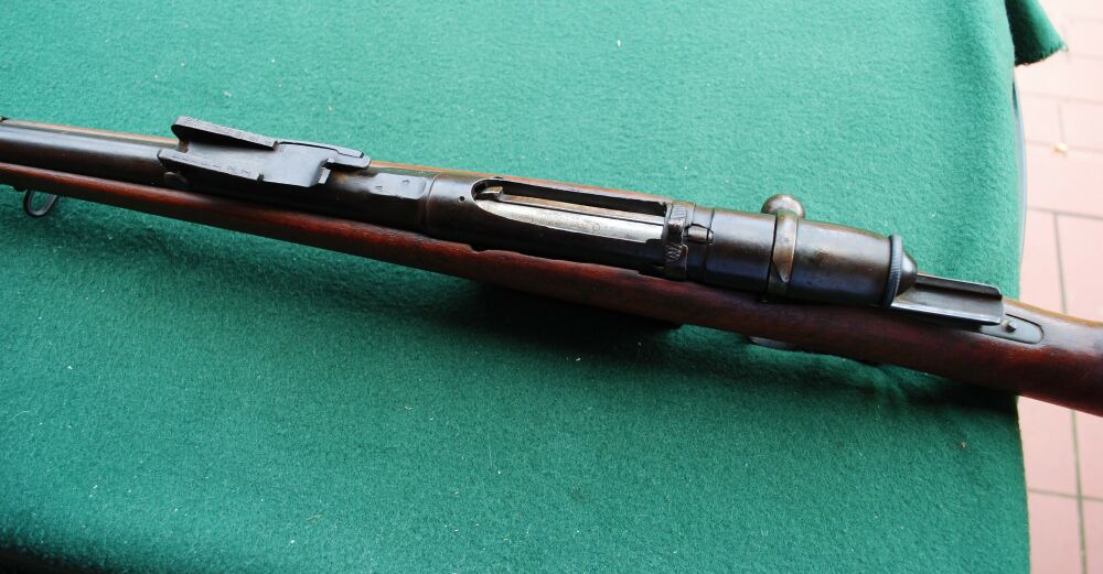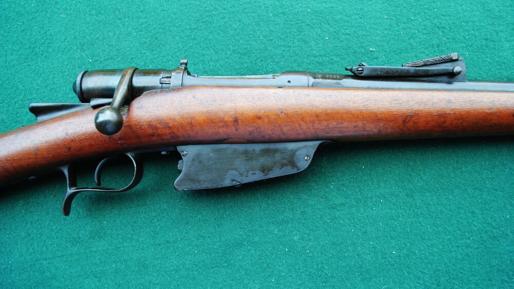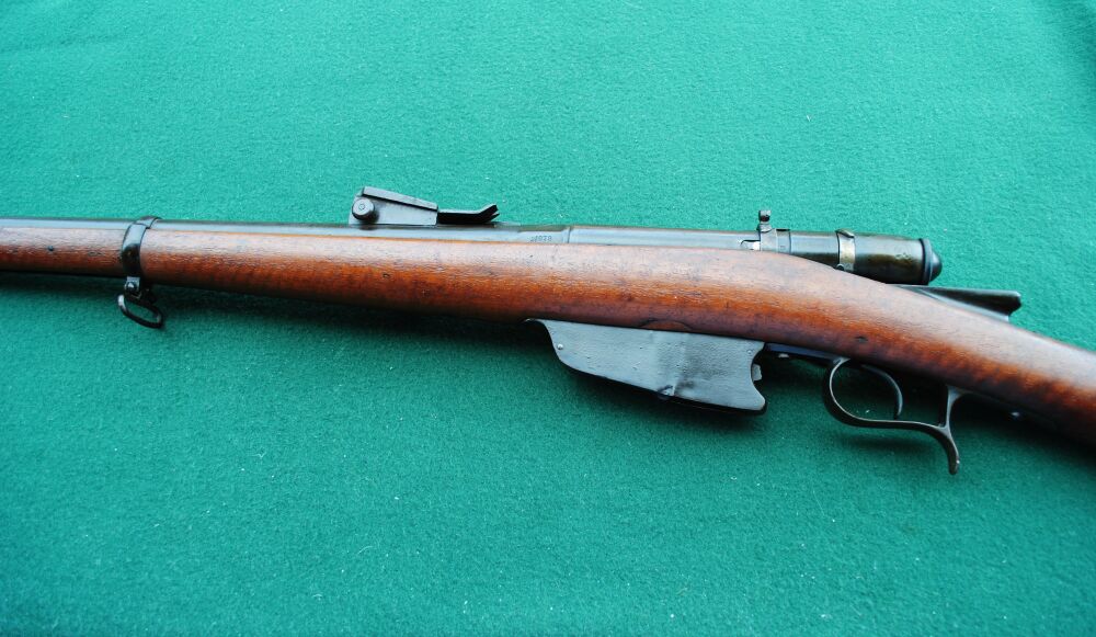 Ital. Ordonanz gefertigt ( Jahreszahl 1878 und Brecia auf der linken Systemseite gestempelt ). Nach 1887 wurde die Waffe zum 4 schüssigen Mehrlader in diesem Kaliber umgebaut. Daher die zweite Jahreszahl 87. Und dann wurde ab 1916 etwas kurioses gemacht, bei der zweiten und letzten Änderung: das Gewehr wurde auf das Kaliber 6,5 mm Carcano umgebaut und bekam neben dem einem Steyr Mannlicher änlichem Magazin für 7 Schuss einen Futterlauf, der sauber in den alten eingepasst und eingelötet wurde! An der Unterseite des Schaftes im Bereich des Magazins sieht man noch die beidseitig verschlossenen Stellen durch das urspüngliche kürzere, aber breitere Magazin. Der Verschluss der Waffe lässt sich einwandfrei repetieren und verschließt fest und spielfrei. Der Lauf ist fast blank und nur minimal rau, aber mit kräftigen, einwandfreien Zügen. Der Putzstock fehlt leider, kann aber sicherlich leicht durch einen zeitgenössischen Stab ersetzt werden. Da das Gewehr keinen gültigen Beschuss hat, kann die Waffe nur von einem Händler, Sammler oder für den Export erworben werden.