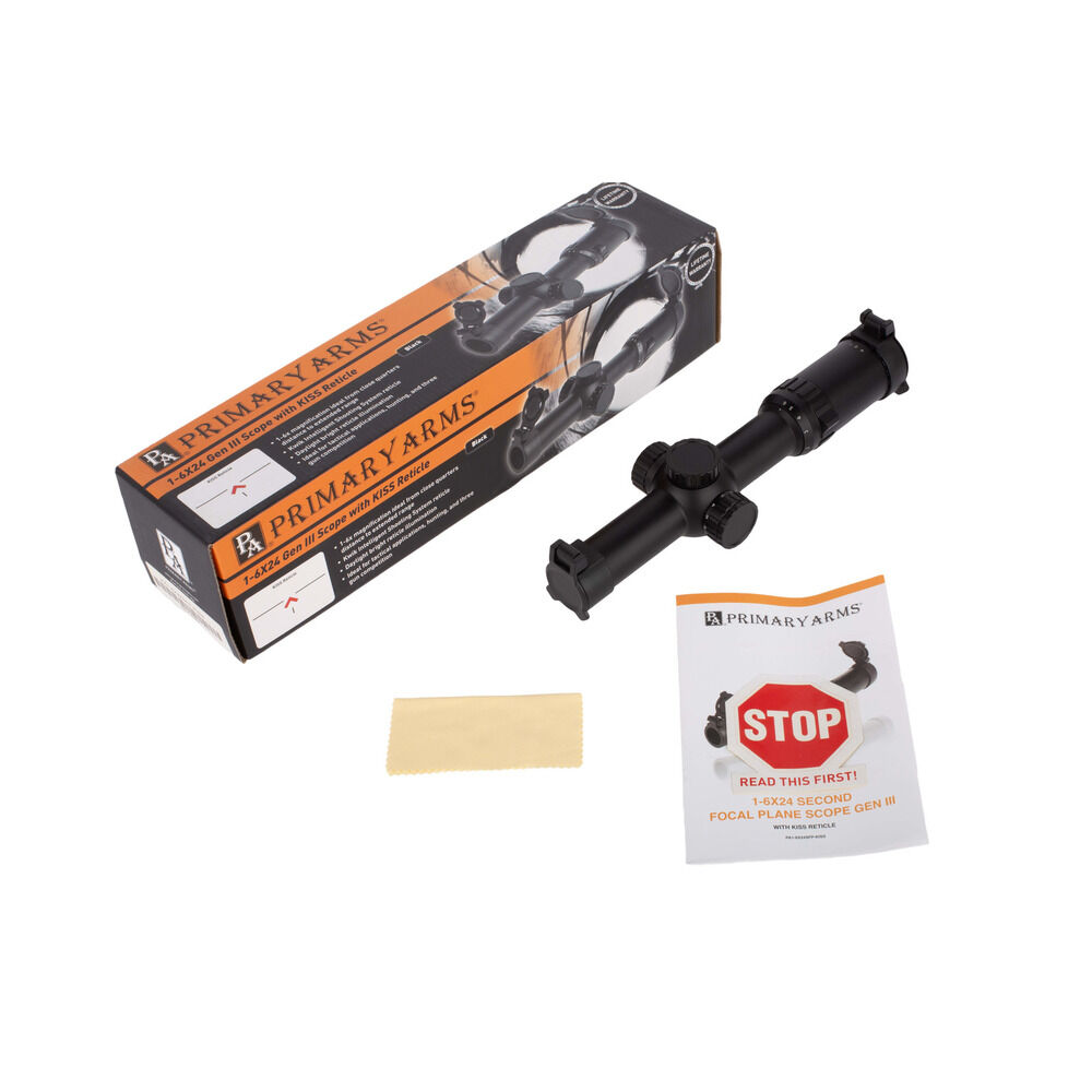 Silver Series SLx 1-6x24mm Gen3 ACSS-KISS Absehen beleuchtet rot, SFP-Absehen zweite Bildebene/Second Focal Plane, 11 Beleuchtungsstufen, 1/2 MOA Klick-Verstellung, Mittelrohrdurchmesser 30mm, Zielfernrohr für Langwaffen, Gehäuse Aluminium, schwarz matt, wasserdicht und beschlagsfrei, Länge 10"/25,4 cm, Gewicht 16,9oz/480 g, 1/eine Batterie CR2032 ist erforderlich, Hersteller SKU PA1-6X24SFP-KISS - MPN 610026, Primary Arms USA. Eine fachgerechte Montage wird empfohlen - Verkauf solange vorrätig!