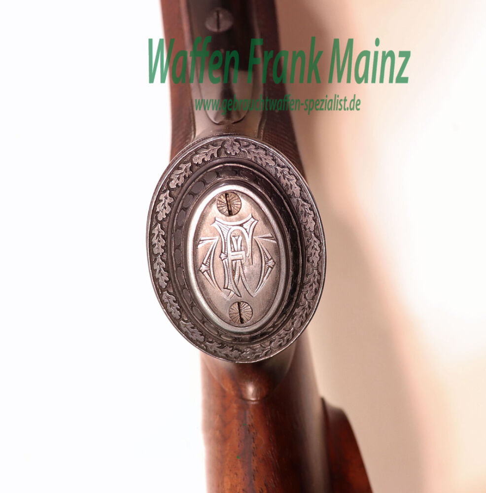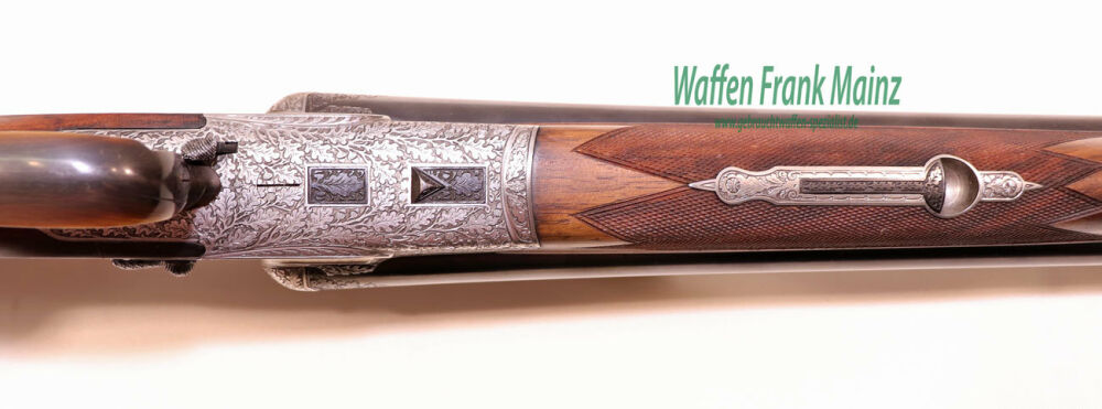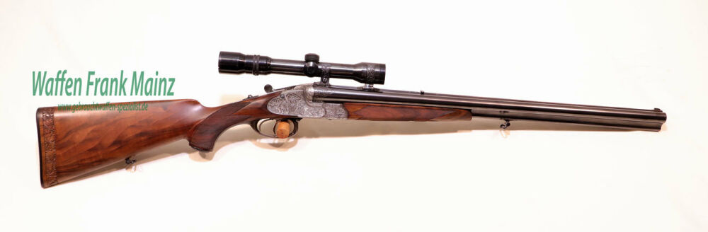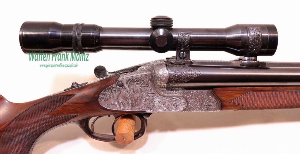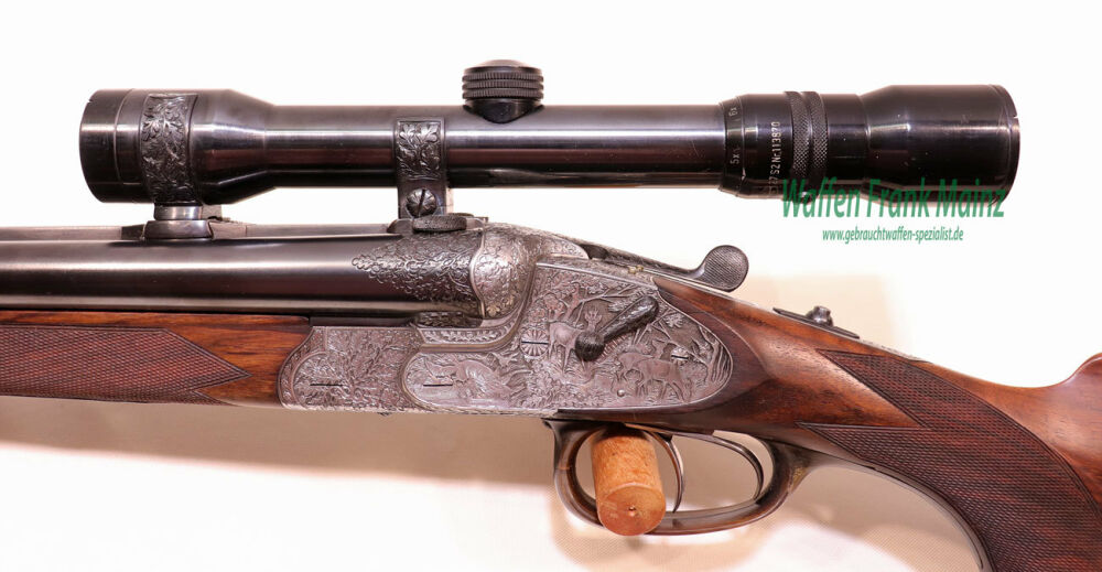 in traumhaftem Erhaltungszustand aus jagdlicher Sammlungsauflösung, gefertigt durch den über die Grenzen bekannten ehemaligen Büchsenmachermeisterbetrieb Robert Schüler, Köln, Stahlsystem mit langen Seitenplatten, vierteiliges Blitzschloss, Schlagstücksicherung auf der linken Schloßplatte, Umschaltschieber von Schrot auf Kugel auf der verlängerten Scheibe, links neben dem Abzugsbügel Umschalter von großer/kleiner Kugel auf den vorderen abzug mit Rückstecher, Signalstifte, doppelte Laufhaken mit zusätzlicher Greenernase und vorgezogene Muschel als Stützwangen, Läufe aus hochwertigem Krupp-Laufstahl, speigelblank, mit jagdlich brauchbarem Zusammenschießen (Einschießmunition noch vorhanden), gelötete Suhler Einhakmontage mit ZF Kahles Helia Super 2,3-7x32 Absehen 4, mit meisterlicher tiefer Jagdstückgravur, linke Seite Fuchs mit Enten und Rehwild, rechts Hirschbrunft und balzender Auerhahn, flächendeckende, tiefgestochene Eichenlaubeinrahmung auf System, Laufwurzel und Montageringen, ebenso auf Pistolegriffkäppchen aus Stahl mit silbereingelegtem Monogramm des Vorbesitzers (kann gegen Aufpreis entfernt oder geändert werden), klassische, elegante Schäftung zum übrigen Stil der Waffe passend, Pistolengriff mit beidseitiger Krawatte, deutsche Backe für Rechtsschützen, und zur Gravur passende Verschneidung als Schaftkranz, Abzugsbügel und Schaftkappe noch aus schön mamoriertem Büffelhorn.....ein museales Stück für den Kenner und Liebhaber hochwertiger, deutscher Vorkriegs-Jagdwaffen....Preis auf Anfrage