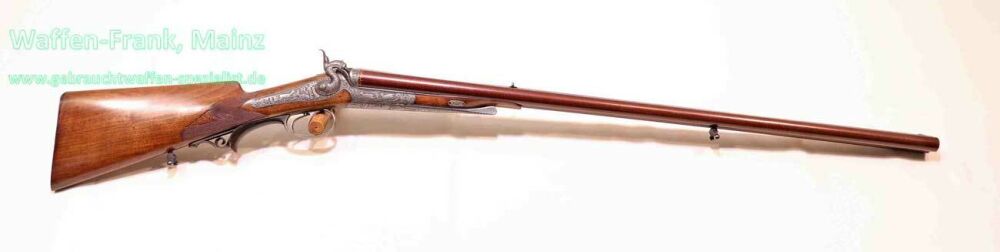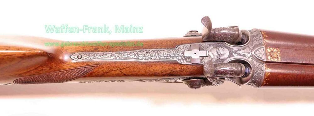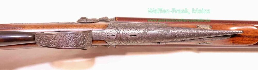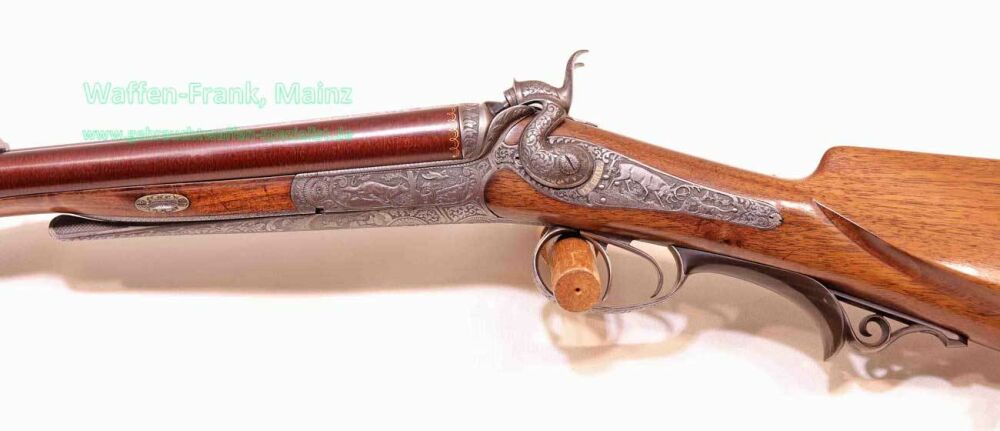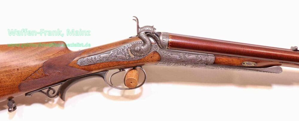 aus Sammlungsauflösung, ein meisterliches Unikat, gefertigt vom kaiserlichen Hof-Büchsenmacher "J. Unger in Graz", goldfarbene Firmenbeschriftung auf der Laufschiene, eingerahmte Herstellermarke/-siegel im Bereich der Laufwurzel, für herrschaftliche Kundschaft gefertigt, mit Rückspringer-Hahn-Seitenschlösser, klassischer Rox-Verschluss mit doppelten Laufhaken, Klapp-Diopter auf der Systemscheibe, museale, tiefe, modellierte Reliefgravur, links Fuchs mit abstreifender Schnäpfe, gestellter Rothirsch durch Schweißhund, rechts Reh- und Gamswildmotiv, auf dem Baskül zwischen den Hähnen Porträt des Lieblingshundes, auf dem darunter liegenden Verschlusshebel Kampf mit Steinadler "nach Graf Arcco-Legende", Abzugsbügel, sowie restliche Schloßteile mit tiefgestochener Blattarabeskengravur und rückliegender Handstütze aus echtem, gemasertem Büffelhorn, der Kugellauf wurde versierte und fachliche Überarbeitung vor mehreren Jahrzehnten in Stahl, Holz und Horn, Banddamast-Laufbündel klassisch gebräunt, wahrscheinlich um 1900 von großkalibriger Expresspatrone auf damals modernes Kaliber 9,3x72R SP durch Futterlauf geändert.....ein museales und äußerst dekoratives Sammlerstück aus der großen Zeit der K&K Monarchie....
