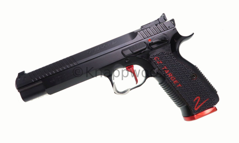 Wettkampfwaffe. Die nächste Generation der CZ 75 SP-01. Entwickelt in Zusammenarbeit mit dem CZ IPSC Team! Prägnante Merkmale sind ein verlängerter Schlitten und Lauf, verstellbare Visierung. Verstellbarer Magazinauslöser. Verkürzter Abzugsweg. Neues Oberflächenfinish. Vergrößertes Checkering am "Front- und Backstrap. High Grip Beavertail. Triangular Hammer. Blaue Aluminium Griffschalen. 19+1 Magazinkapazität.