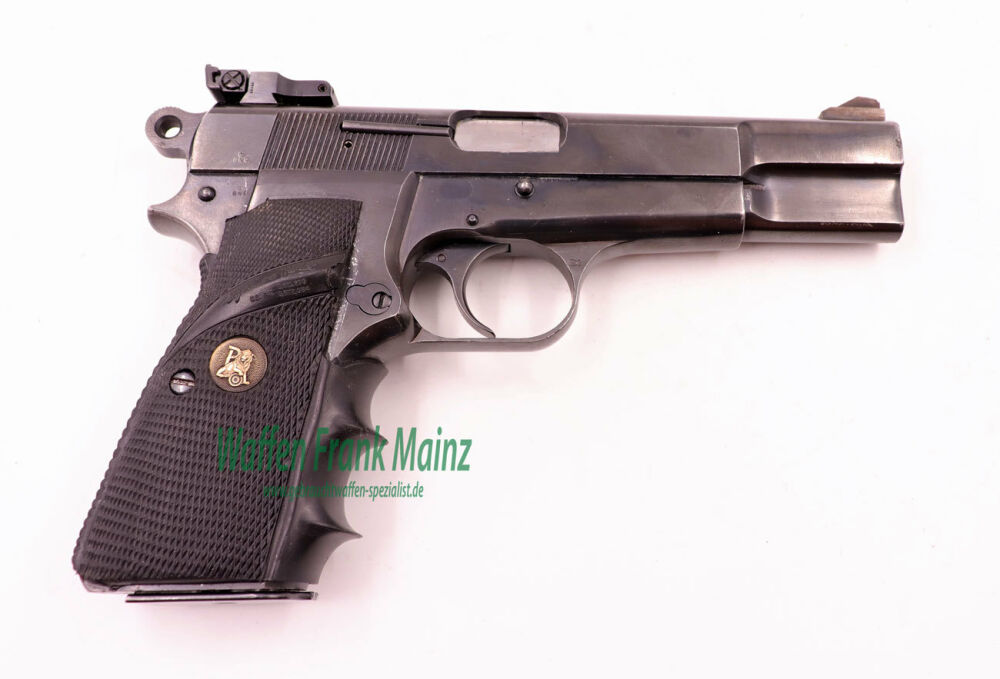 für den Export, in England nachträgliche Änderung des Kalibers von 9x19 auf das leistungsstärkere Kaliber 9x21, mit englischem, zivilem Neubeschuss (Munition ab Lager), mit verstellbarem Visier, Pachmayr Gummigriffschalen, Lauf spiegelblank.......ein erfolgreicher Versuch Waffen im Kal. 9x19 ohne großen technischen Ausfwand auf die leistungsstärkere Patrone 9x21 (+ 25% Leistung) zu ändern....