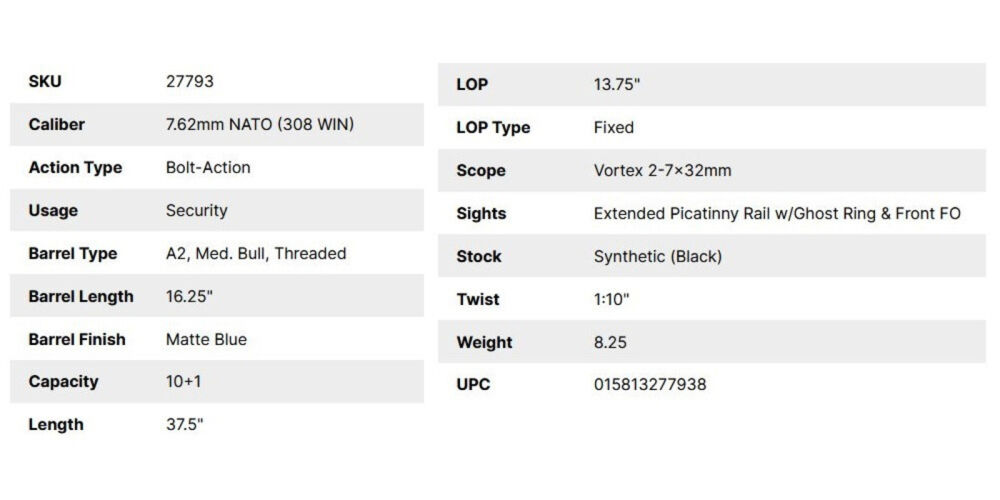 Kaliber .308Win, Rep.Büchse/Rifle MVP Scout 10+1 Patronen matt brüniert, Lauf 16,25"/42cm mit dickem Laufprofil/Medium Bull Barrel, Mündungsgewinde 5/8x24" mit Mündungsfeuerdämpfer A2-Style und Gewindeschutzkappe, die meisten AR Magazine können verwendet werden, Visierung Ghost Ring mit Fiber Visierkorn rot, LBA® Abzug verstellbar von 3lbs/1.362gramm bis 7lbs/3.178gramm, montierte lange Picatinny Schiene 11"/28cm für die Montage von Zielfernrohren mit langem oder kurzem Augenabstand geeignet, Synthetik Schaft Pillar gebettet schwarz und 2/zwei vorne seitlich montierten Top-Rails Picatinny, 1/ein Magazin 10 Patronen, Gewicht 8,25lbs/3.745gramm, Gesamtlänge 37,5"/95,25cm, Code 27793 Mossberg USA. Lieferung, nicht montiert, mit Zielfernrohr Vortex 2-7x32 Crossfire II Long Eye/langer Augenabstand und Montageringe - Neu 2022!