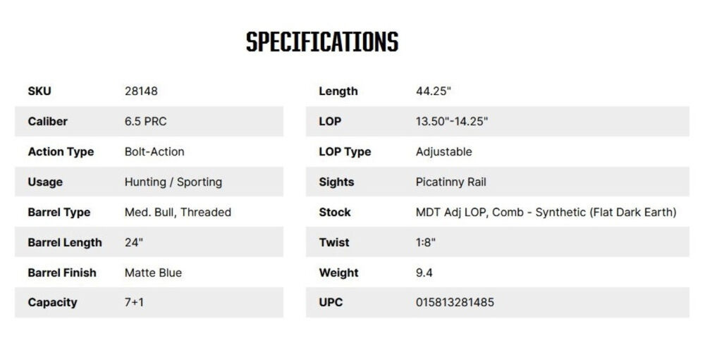 Kaliber 6,5mmPRC, Rep.Büchse Patriot LR-Long Range Tactical 7+1 Patronen, Med.Bull Lauf Länge 24"/61cm mit Mündungsgewinde 5/8x24TPI, MDT Schaft mit massiver V-Block Bettung und M-LOK Aufnahmen,Schaftlänge und Wangenauflage verstellbar, entnehmbares 7/sieben Patronen Magazin nach AICS-Standard, Picatinny Montageschiene mit 20 MOA Vorneigung, Schäftung in Sandfarbe FDE matt mit schwarzer Kontrasteinlage am Griff, Lauf schwarz matt, Patented LBA® Abzug verstellbar 2lbs/908gramm bis 7lbs/3.178gramm, Gesamtlänge 44,25"/112,4cm, Gesamtgewicht 9,4lbs/4.268gramm ohne Munition, Code 28148 Mossberg USA.