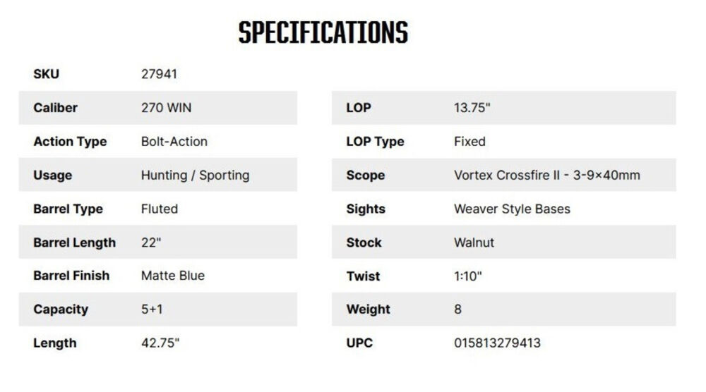 Kaliber .270Win, Rep.Büchse Patriot Walnut 5+1 Patronen mit Zielfernrohr Vortex 3-9x40mm Crossfire II, Lauflänge 22"/55,9cm, kannelierter Verschluss, Lauf gefluted, entnehmbares 5/fünf Patronen Magazin, Weaver Style Montage 2-teilig, schöne Schäftung aus amerikanischem Walnussholz, Lauf und System matte Brünierung schwarz, Patented LBA® Abzug verstellbar von 2lbs/908gramm bis 7lbs/3.178gramm, Gesamtlänge 42,75"/108,6cm, Gewicht 8lbs/3.632gramm, Combo Set Code 27941 Mossberg USA. Zielfernrohr ist nicht fertig montiert und justiert!