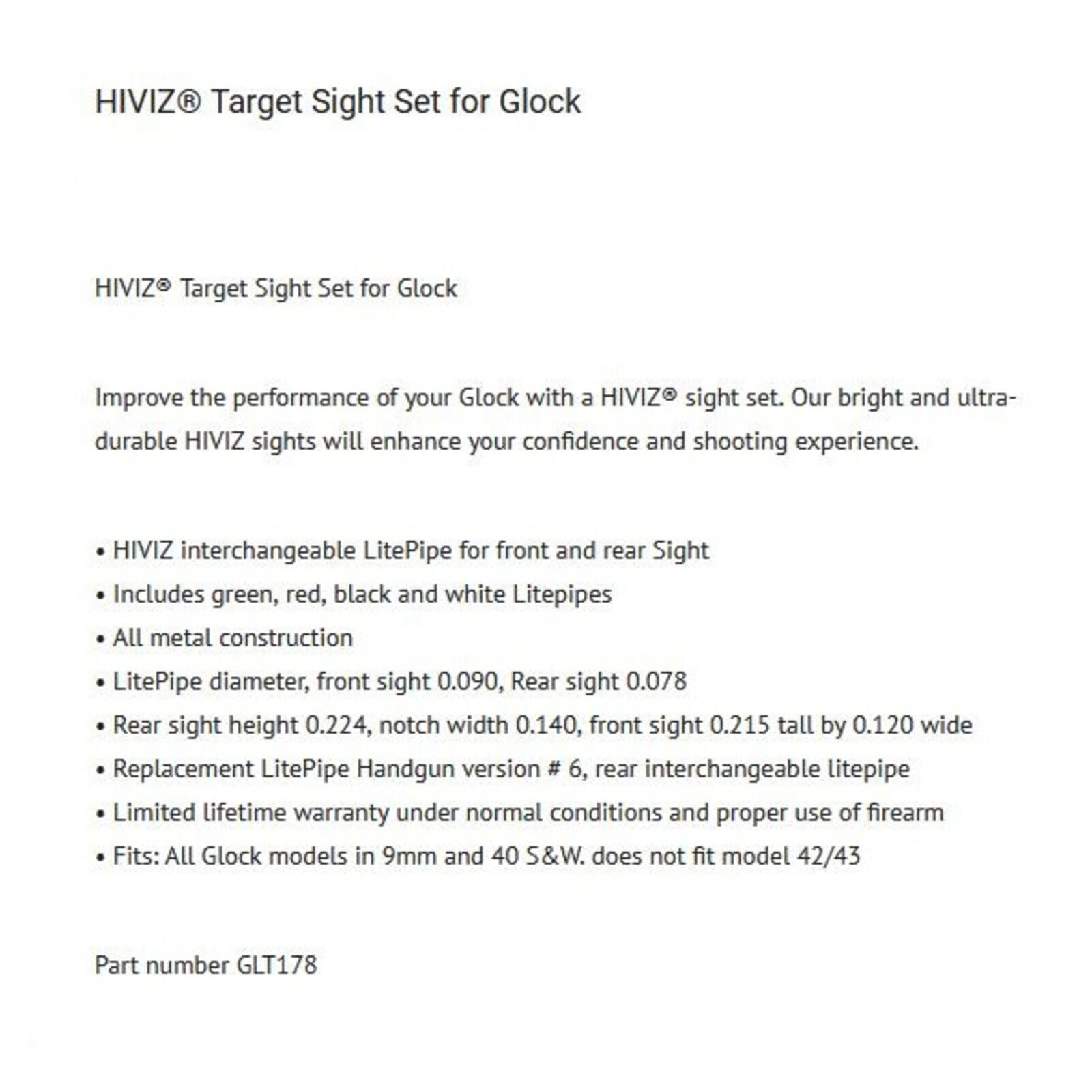 Kaliber 9mmLuger/.40S&W, Glock Pistolen, Visierset Target Fiber rot und Visierkorn grün, inclusive grün, rot, schwarz und weiß Litepipes, HIVIZ USA. Eine fachgerechte Montage wird empfohlen - nicht für die Modelle 42 & 43 geeignet!