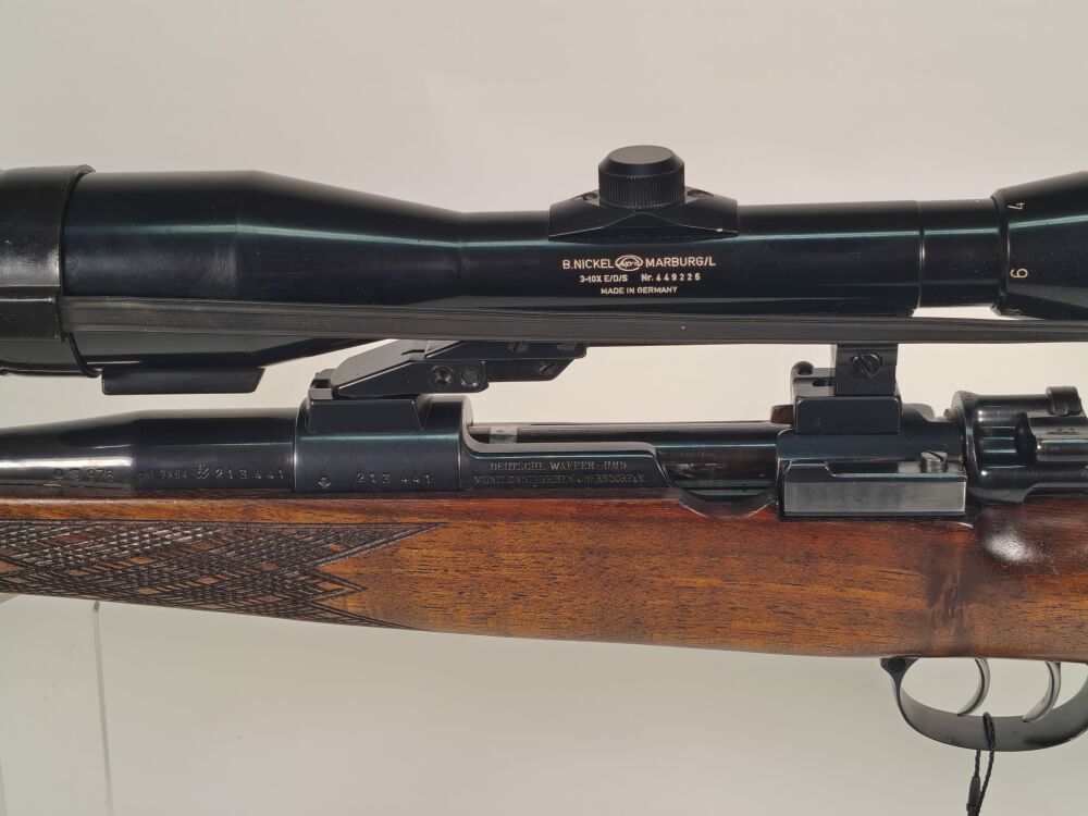 Zum Verkauf steht eine Frankonia Modell Favorit De Luxe im Kaliber 7x64. Die Repetierbüchse ist mit einem B. Nickel 3-10x40 Zielfernrohr auf Schwenkmontage ausgestattet und bietet damit eine klassische, jagdlich bewährte Kombination.