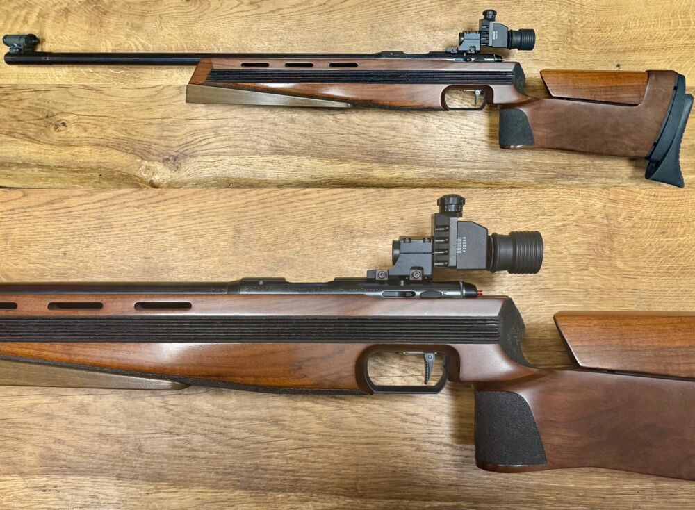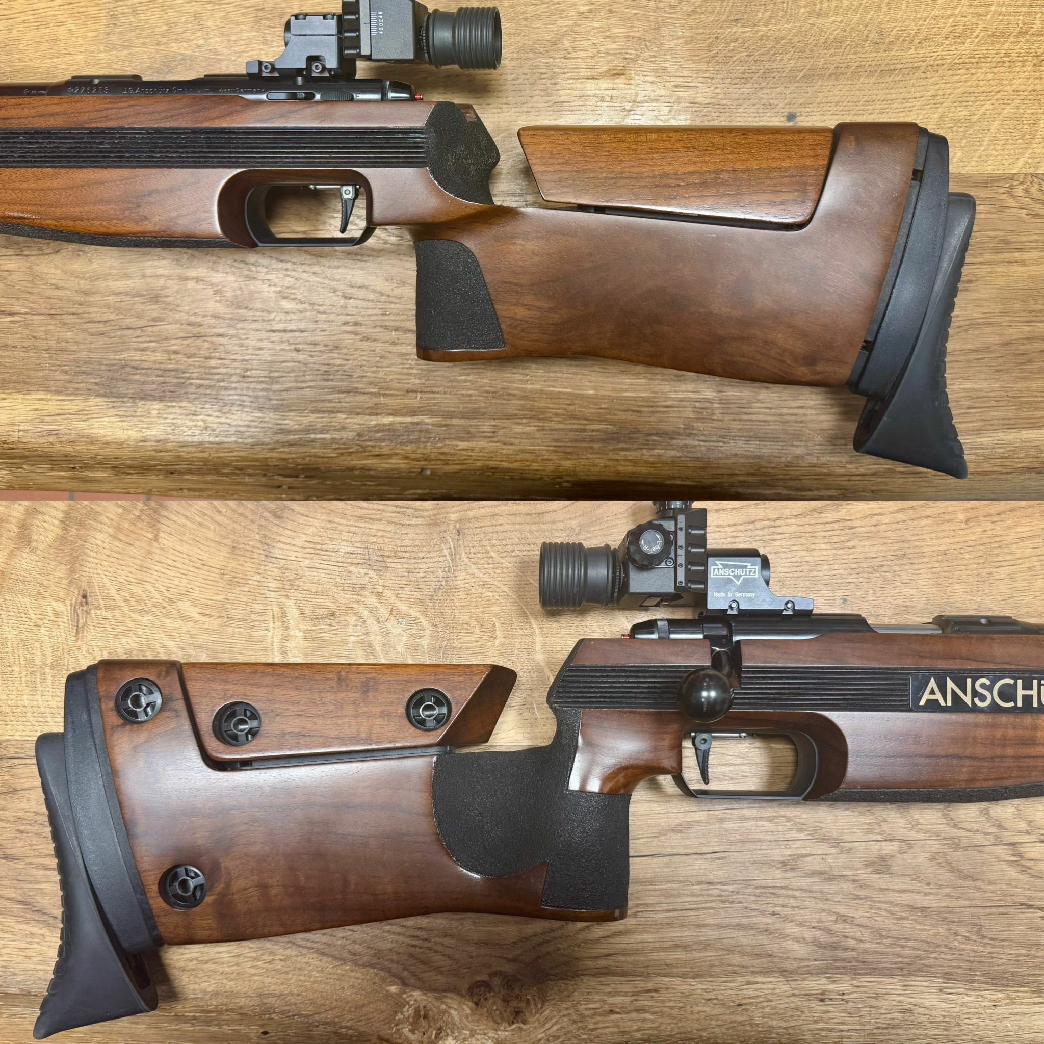 Es handelt sich um eine Matchwaffe mit verstellbarerem Schaft und Diopter-Visierung. Im Voderschaft ist eine Schiene angebracht, an dieser ist ein Auflagekeil aus Holz montiert.