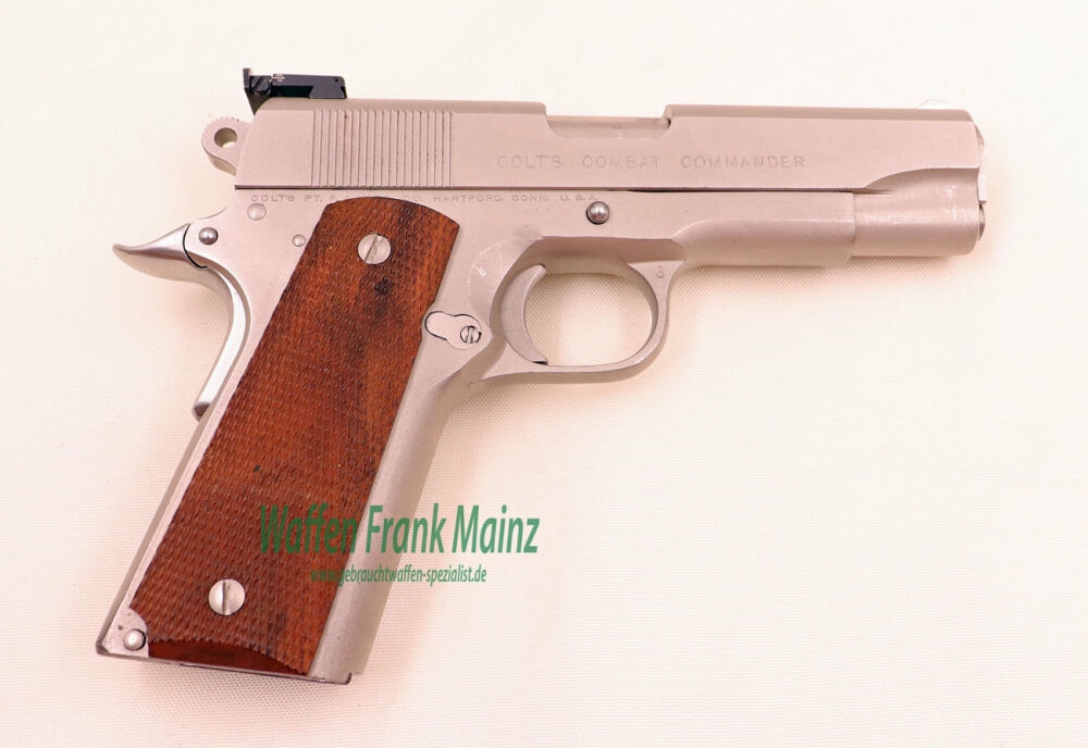 selten geschossene Schrankwaffe, mit Original satiniertem Außenfinish, Bedienteile blank poliert, Holzgriffschalen mit noch scharfer Fischhaut, fachliche Umrüstung auf verstellbares Visier, mit komplettem original Colt Wechselsystem in Kal. 9mmLuger, ebenfalls fachlich mit BO-MAR Matchvisier ausgestattet, mit kompletter Bedienungsanleitung in englisch, in angefertigter Holzkassette mit jeweils einem Ersatzmagazin....noch aus der hochwertig gefertigten 70er Serie, (bei Erwerb einer Basiswaffe im größeren oder gleichen Kaliber muss das Wechselsystem nur angemeldet, nicht genehmigt werden).......ohne Wechselsystem, nur Basiswaffe EUR 675,-