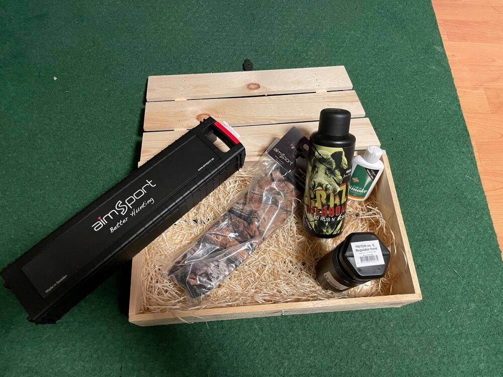 AIMSport WILDBoar Edition 2022 1 xSchalldämpfer Triton No.5 1x Neopren Wendehülle 1x Crazy Wildboar Locker 1x Wind Checker 1x Holzkiste