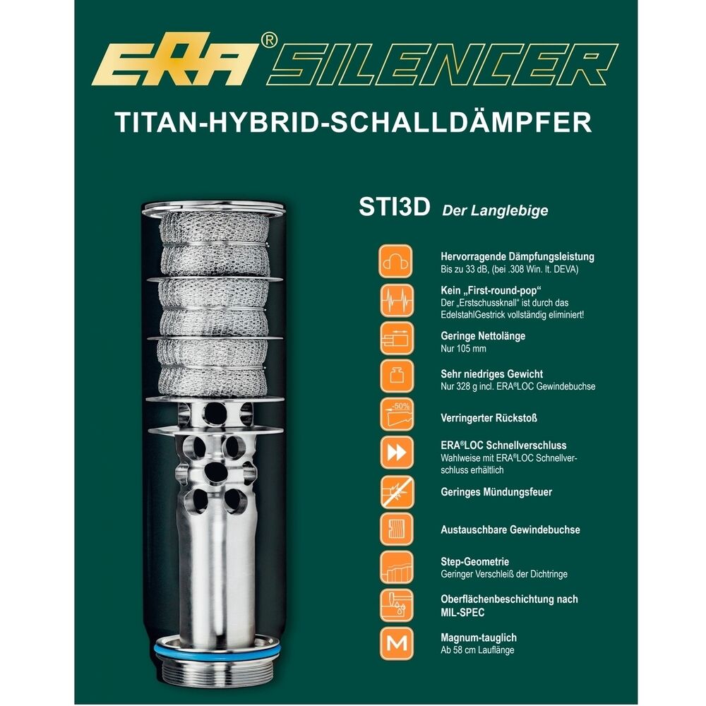 Auf Basis des bewährten Schalldämpfermodells ERA Silencer SOB3D wurde das Modell STI3D entwickelt. Bei dem neuen Modell STI3D wird das Blendenteil inklusive Over-Barrel-Rohr aus nur einem Stück Titan Grade 5 gefertigt. Diese für den Triebwerksbau entwickelte Legierung zeichnet sich durch hervorragende Korrosionsbeständigkeit und geringes Gewicht bei gleichzeitig sehr hoher Festigkeit aus. Im Ergebnis ist ein extrem belastbarer Schalldämpfer entstanden, der eine hervorragende Verschleißfestigkeit und eine lange Lebensdauer bietet. In Verbindung mit dem integrierten Edelstahl-Gestrick werden exzellente Dämpfungswerte erzielt. Kompakte Abmessungen und das niedrige Gewicht erhalten die Führigkeit der Waffe.
