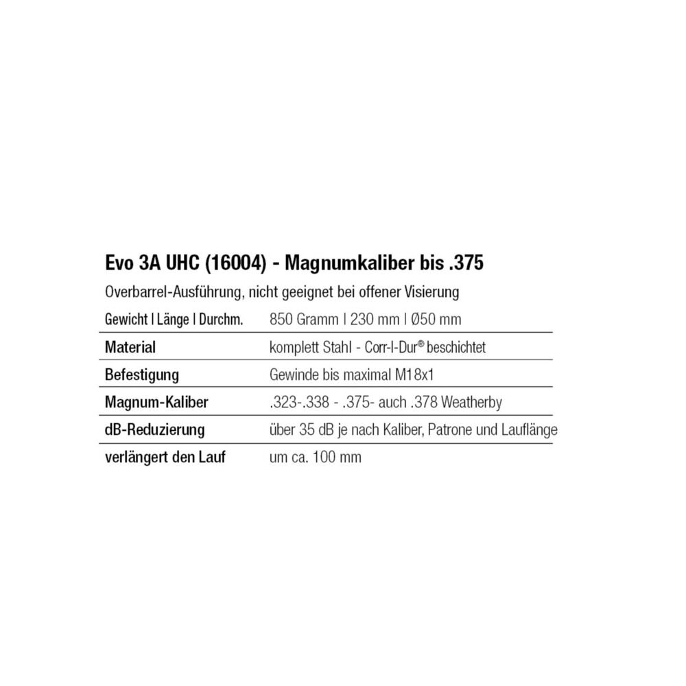 Over-Barrel-Schalldämpfer, EVO 3A UHC-Ultra Heavy Caliber Mündungsgewinde M17x1, komplett aus Stahl gefertigt, Beschichtung Corr-I-Dur® schwarz, Gewindeeinsatz Stahl, Kaliber .375/.338 und auch .378Weatherby, nicht geeignet für Läufe mit offener Visierung, Länge 230mm - verlängert den Lauf um ca.100mm, Gewicht 860gramm, Außendurchmesser 50mm, Dämpfleistung bis zu 35 dB je nach Kaliber und Lauflänge, der Schalldämpfer ist wartungsfrei, Code 16004 Small Arms Industries Dänemark.