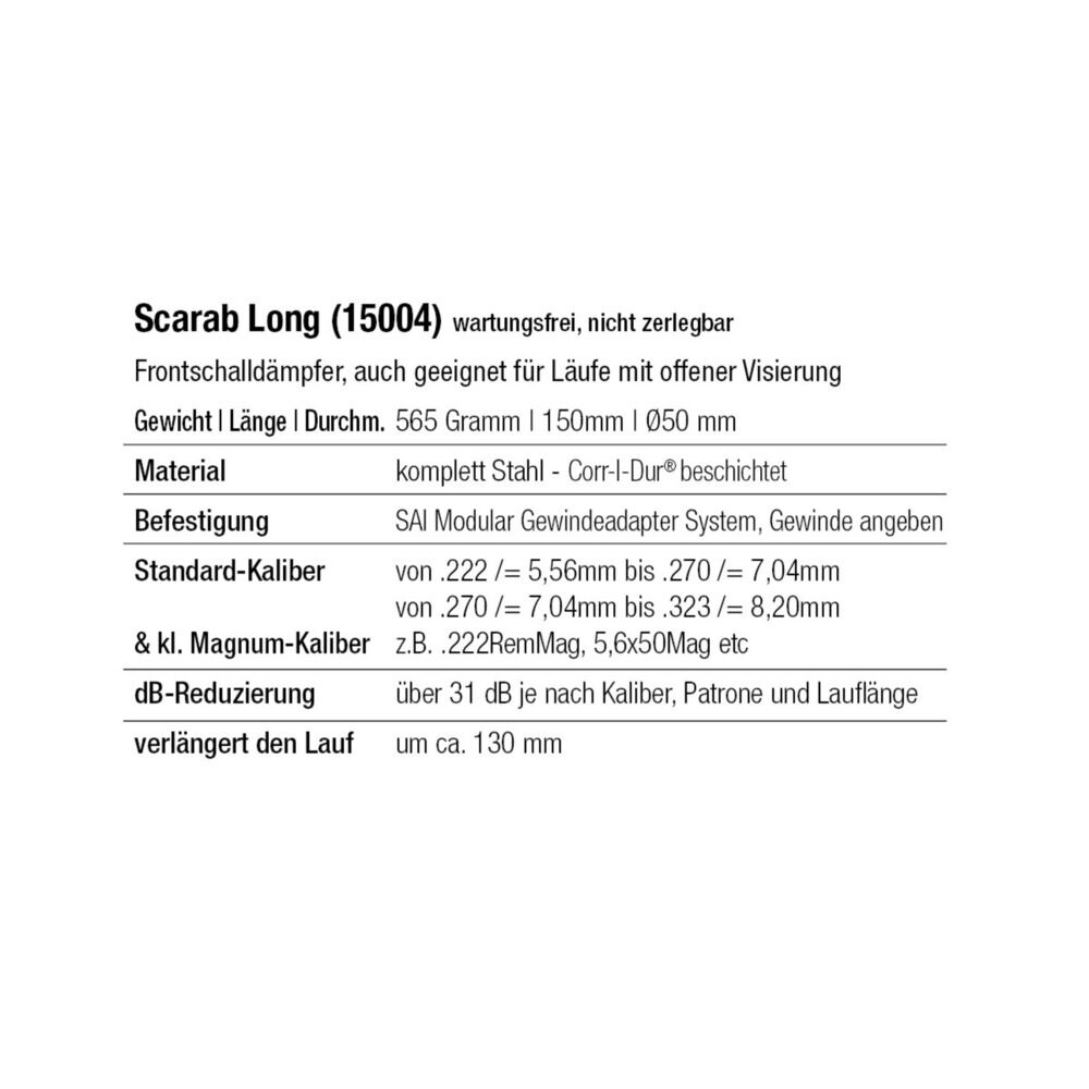 Der SCARAB ist ein robuster Front-Schalldämpfer für einläufige Büchsen mit offener Visierung. Er ist die erste Wahl, wenn es um erhöhte Schalldämpfung in Kompaktbauweise geht - geeignet für einläufige Büchsen, Repetier- und halbautomatische Büchsen.