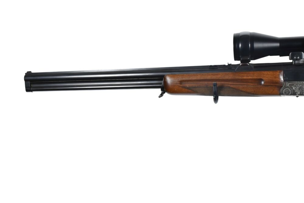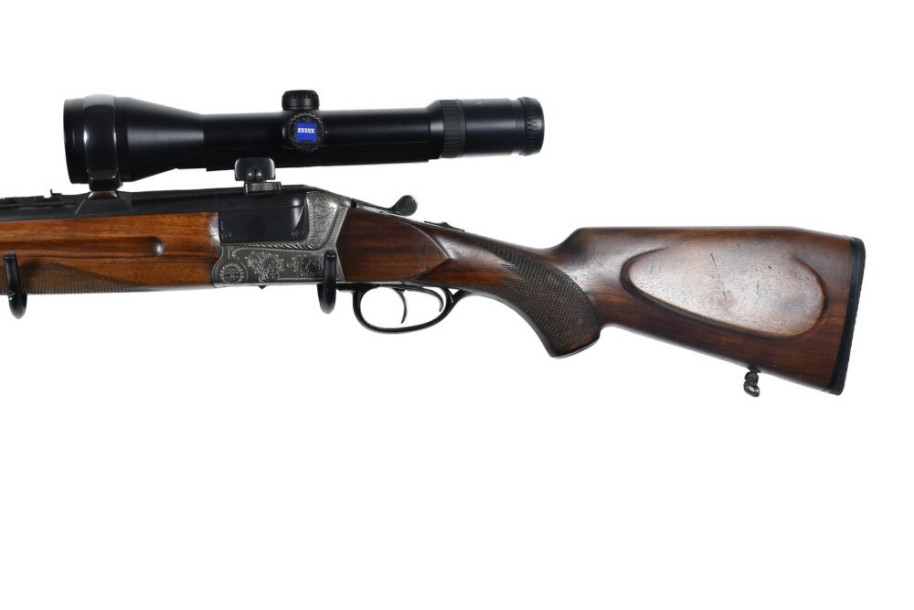 Diese Krieghoff Bockbüchsflinte im Kaliber 7x65R und 12/70 verfügt über eine Gesamtlänge von 105 cm, eine Lauflänge von 63 cm und eine Schaftlänge von 34 cm. Zur Ausstattung gehören ein zusätzlicher Austauschlauf sowie ein Einstecklauf im Kaliber 5,6x50 Magnum (im 12/70 Lauf integriert). Montiert ist ein Zeiss Diavari 2,5-10x50 T Zielfernrohr, bei dem der Leuchtpunkt defekt ist. Die Waffe trägt einen deutschen Beschuss.