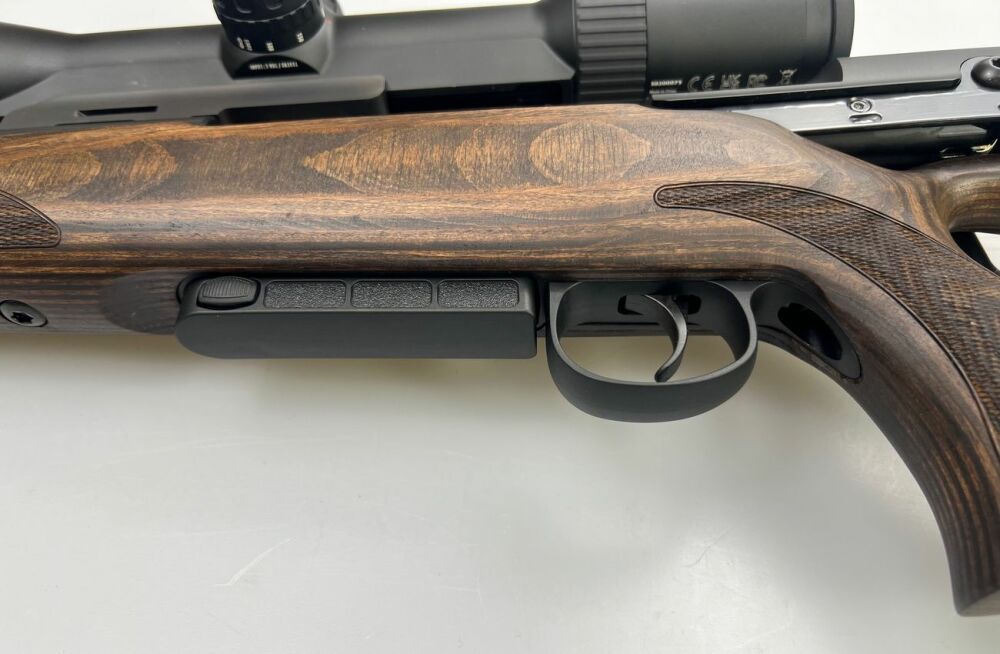 Der gerade Kammerstängel ist ergonomisch optimiert über dem Abzug angebracht für schnellstes Repetieren. Die Zweistellungssicherung wirkt direkt auf das Schlagstück und liegt gut fühlbar zwischen Kolbenhals und Verschluss. Per Daumendruck kann die Transportsicherung gelöst werden, somit lässt sich die Kammer auch im gesicherten Zustand öffnen.