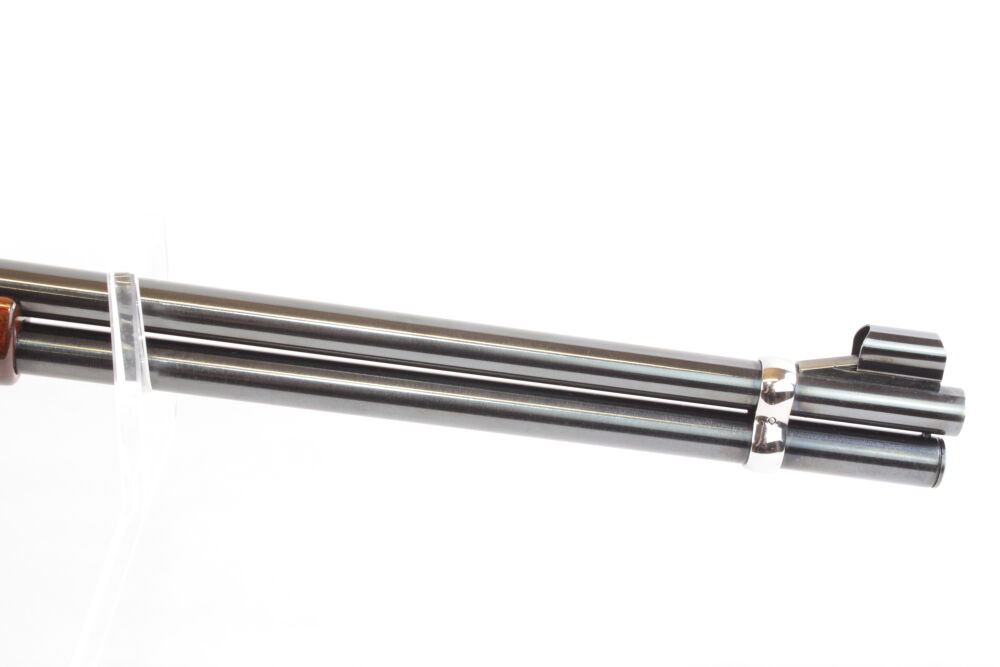 Diese spezifische Ausführung im leistungsstarken Kaliber .44 Remington Magnum besticht durch eine außergewöhnliche Optik. Das Systemgehäuse, der Verschluss sowie der Ladehebel und weitere Akzente sind hochwertig vernickelt, was der Waffe einen edlen und markanten Kontrast zum klassischen Holzschaft verleiht.