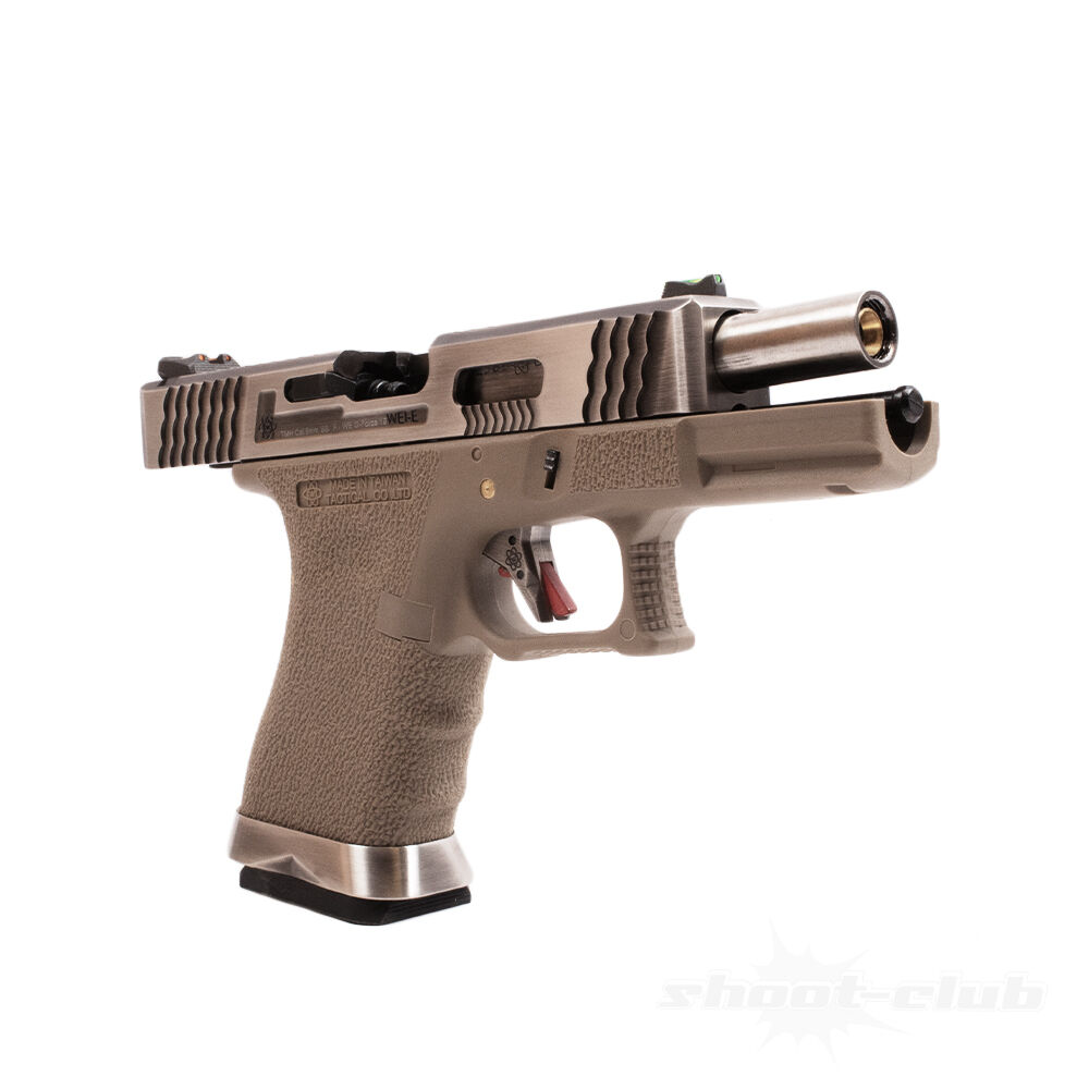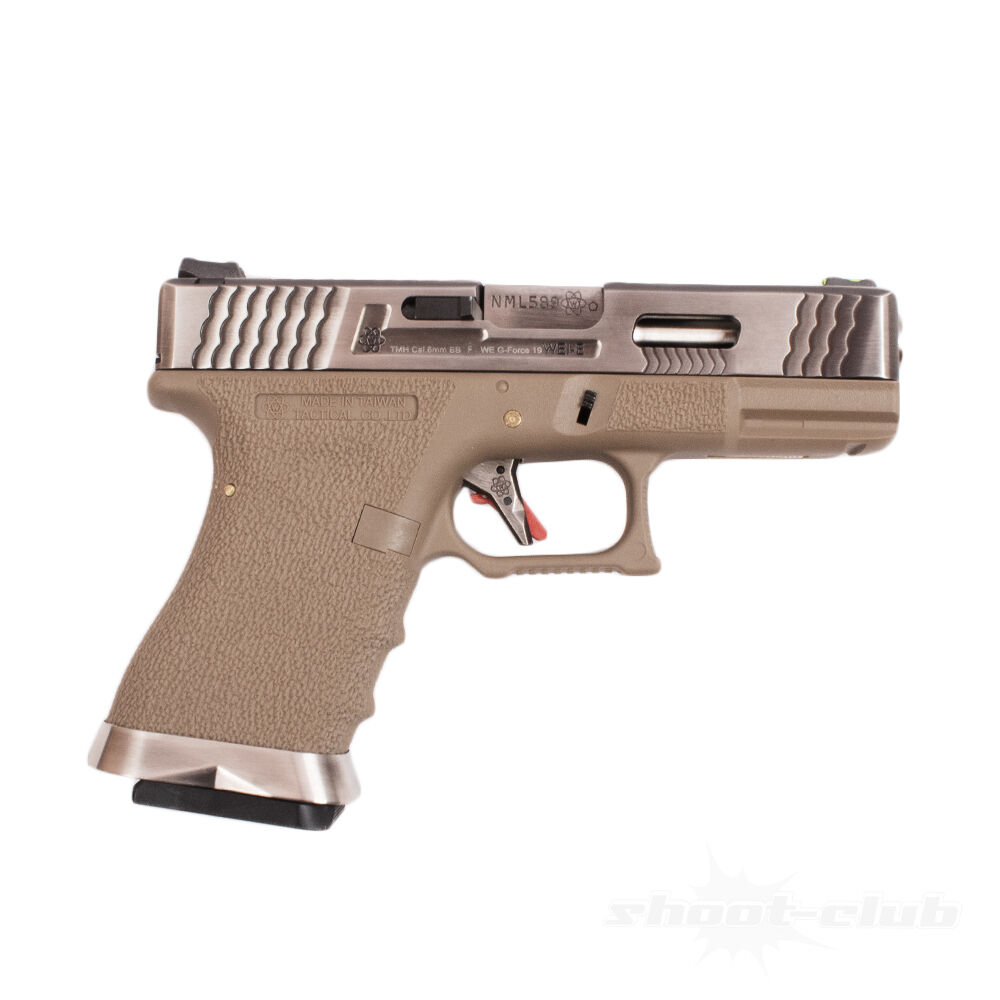 Die WE G-Force 19 Airsoft Pistole kommt in dieser Variante als Gas Blow Back Pistole mit tan-farbenen Gehäuse sowie Silver-Barrel und -Schlitten. Hauptaugenmerk bei der Waffe ist das auffällige Design. Schlitten und Lauf sehen optisch aus wie gebürsteter Stahl. Die wellenförmigen Fräsungen am Metallschlitten sorgen für eine außerordentlich hohe Griffigkeit. So ist das Bedienen des Schlittens auch bei nasser Oberfläche gar kein Problem. Auf der Rückseite der Waffe ziert ein kleiner Totenkopf den Schlitten und ist ein echter Hingucker. Die Pistole besitzt eine Fiberoptik-Visierung mit grün fluoreszierendem Korn und rot fluoreszierender Kimme. Das Gehäuse selbst hat eine raue Oberfläche, die ebenfalls wie der Schlitten für guten Halt sorgt. Der Griff hat eine prima Ergonomie, ist aber nur für Rechtshänder ausgelegt, da sich der Magazinauslöseknopf sowie auch der Schlittenfanghebel auf der linken Seite der Waffe befinden. Die WE G-Force Metal Custom kommt mit einer Abzugssicherung, ähnlich wie bei der weltweit bekannten Glock. Das Magazin kann mit Hilfe des vormontierten Mag Well ziemlich leicht und fast schon intuitiv eingeführt werden. Kein verkannten oder verhaken mehr, schnelles Nachladen garantiert.