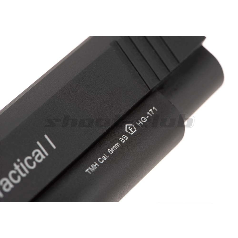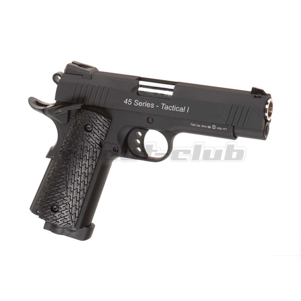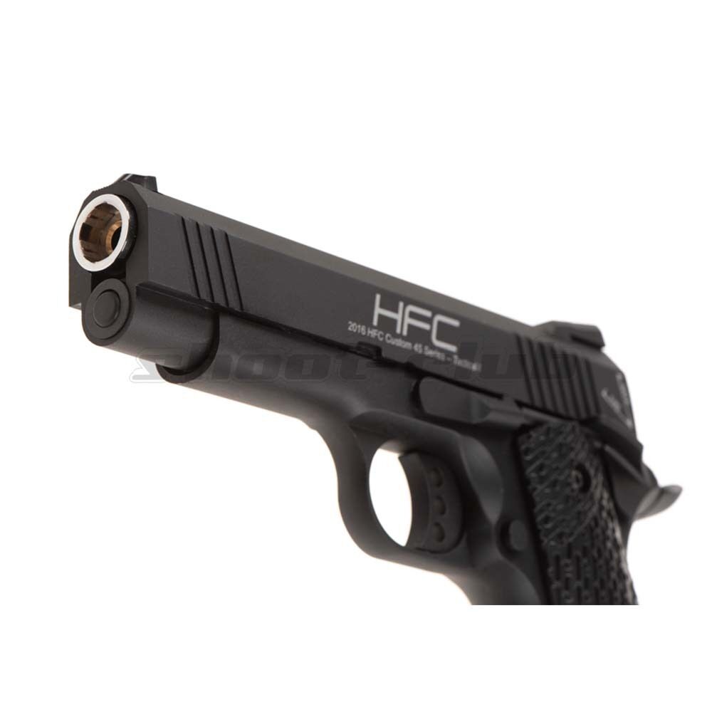 Wie unschwer zu erkennen ist, handelt es sich bei diesem Nachbau um eine Airsoft Version einer 1911er. Absoluter Pluspunkt ist das im Lieferumfang enthaltene Griffstück bzw. Bodycover mit taktischer Picatinnyschiene an der Gehäuseunterseite sowie der Fakt, dass die Waffe per Gas Magazin oder Co2 Magazin betrieben werden kann. Auch beim Hersteller HFC besitzt sie typische Markings und Bedienelemente, die das scharfe Vorbild aufweist. Allem voran die Handballensicherung, die den Schuss erst freigibt, wenn mit dem Handballen auf den oberen Griffrücken Druck ausgeübt wird. Zur Unterstützung bietet der Beavertail Halt und vermittelt dem Schützen ein sicheres Gefühl. Die Griffschalen bestehen, im Gegensatz zum Rest der Waffe, aus Kunststoff und haben eine raue, griffige Oberfläche. Der moderne Abzug mit Lochoptik und die anderen Bedienelemente sind gut erreichbar. Die Waffe eignet sich aufgrund der einseitigen Anordnung eher für Rechtshänder. Für den präzisen Schuss steht ein einstellbares Hop-Up zur Verfügung sowie eine offene Visierung mit Balkenkorn.