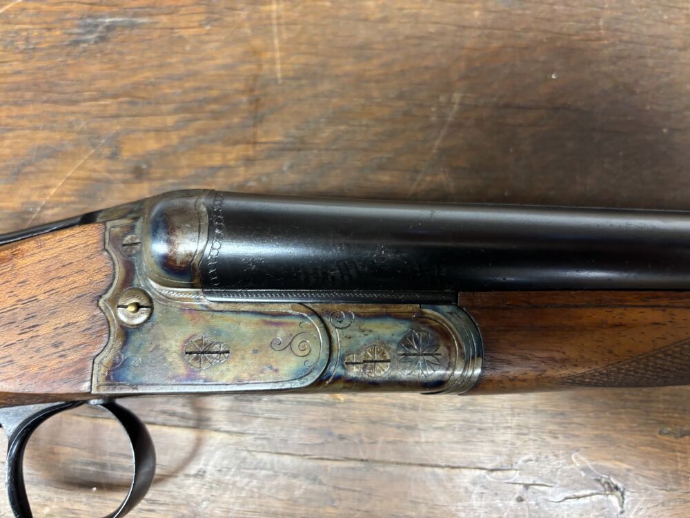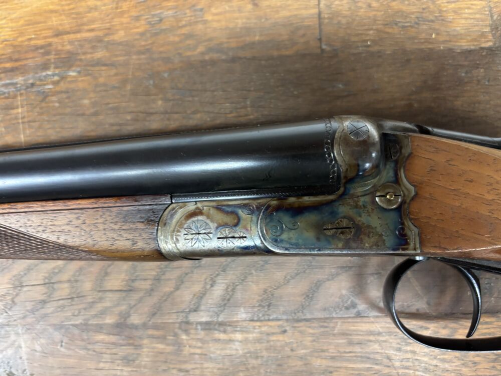 Eine elegannte führige, leicht und ausgewogene Doppelflinte mit zeitloser Gravur und sehr gut erhaltener Bundhärtung,mit Doppelabzug und Automatischer Sicherung.
