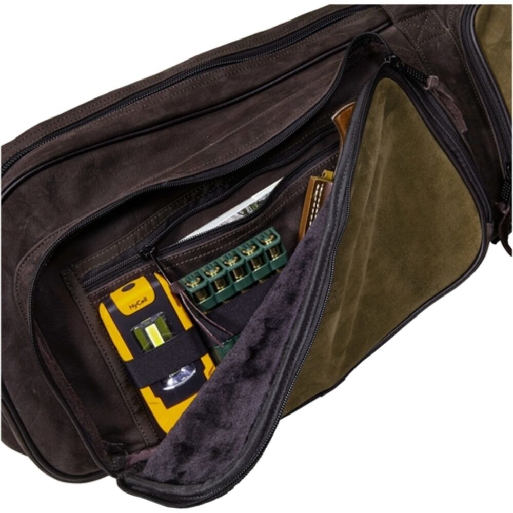Das Gewehrfutteral "All-in" ist aus echtem Leder gefertigt und verstaut, wie der Name schon sagt, alles wichtige übersichtlich in einer Transporttasche.