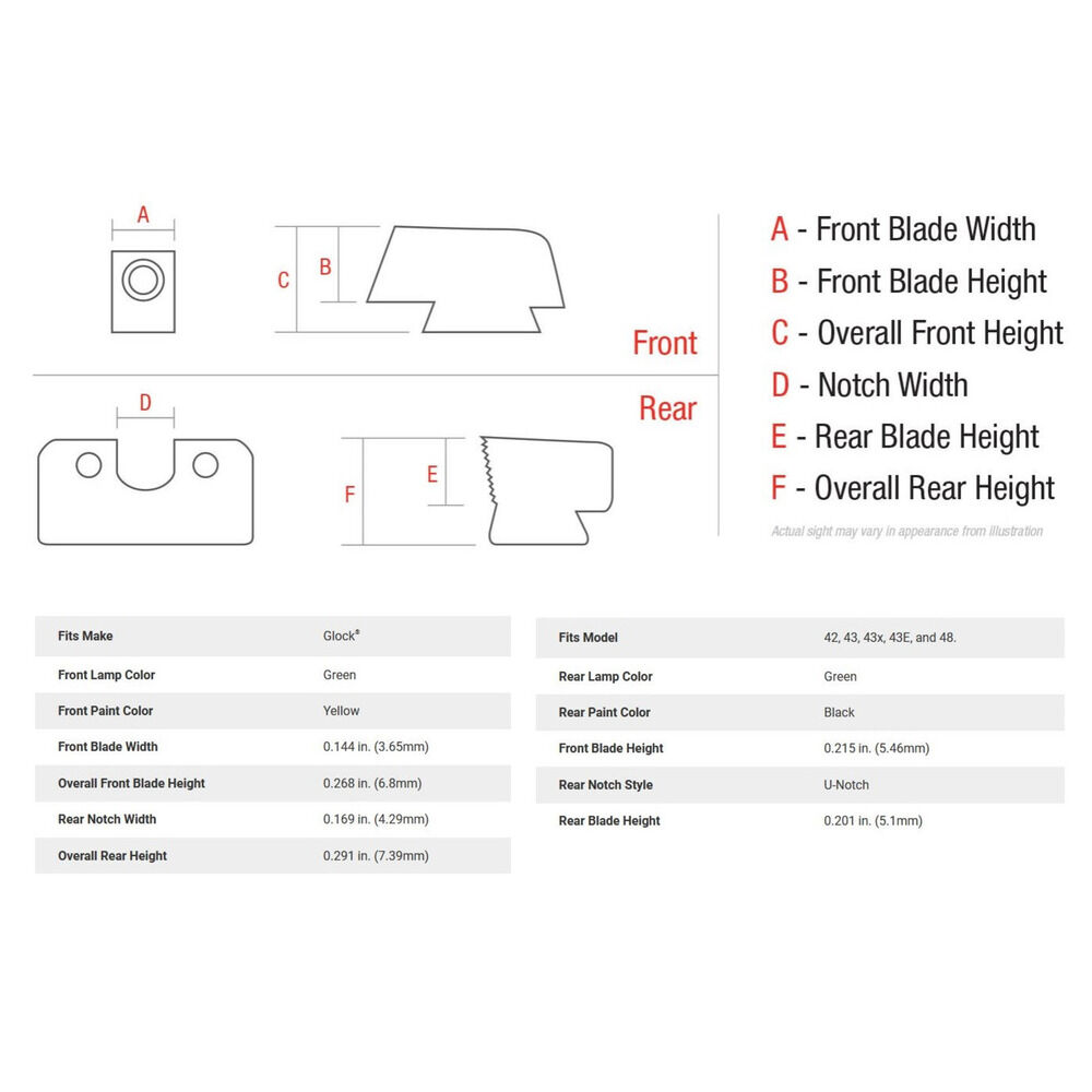 Pistole Glock Modell 42, 43, 43x, 43E & 48, Nacht Visierset grün/grün selbstleuchtend mit/und nur Visierkorn Dot gelb umrandet Daylight, Serie HD Tactical Shooter, breites Visierkorn und Visierblatt geriffelt mit breitem U-Shaped Notch schwarz, Code GL113 Trijicon USA. Nacharbeiten sind eventuell erforderlich - eine fachgerechte Montage wird empfohlen!