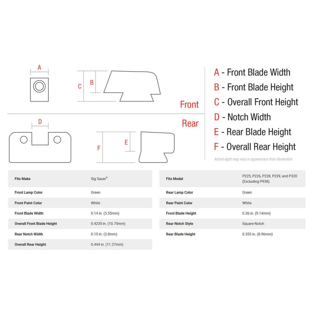 Kaliber 9mmLuger und/oder .357SIG, Pistole SIG Sauer Modell P225, P226, P228, P239 und/oder P320 Suppressor/Schalldämpfer passt nicht für Modelle SIG X-Five oder Six, Bright & Tough Nacht Visierset grün mit Visierkorn grün selbstleuchtend 3-Dot weiß umrandet, hohe Ausführung für Supp-Schalldämpfer Modelle, Code SG201-C-600907 Trijicon USA. Nacharbeiten sind eventuell erforderlich - eine fachgerechte Montage wird empfohlen!