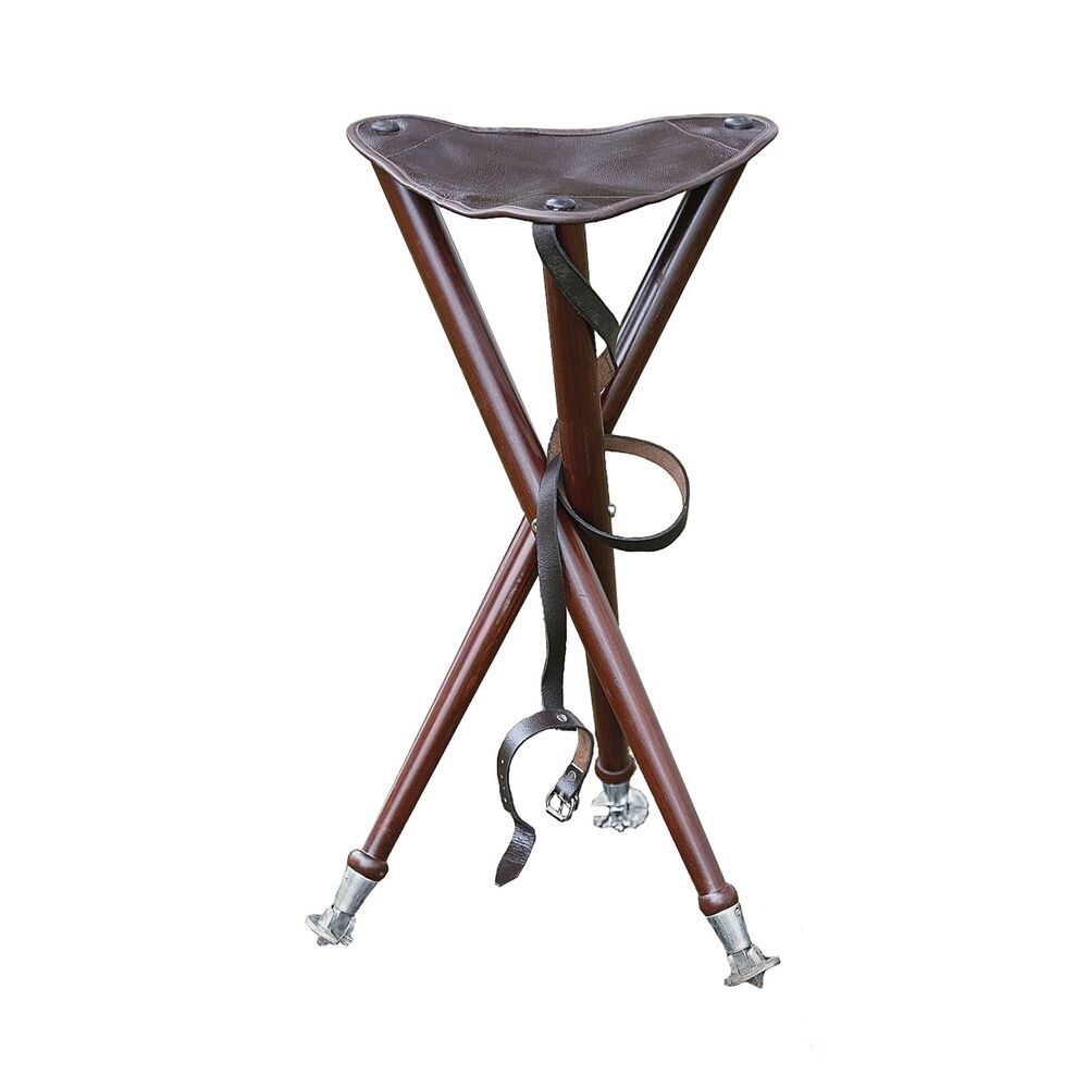 Hochwertige, robuste Verarbeitung mit Kunstleder-Einfassungen an der Büffelleder-Sitzfläche. Die Sitzfläche ist mit Nägeln/Nieten befestigt. Das Holz des Dreibeins stammt vom Zederachbaum. Inklusive Leder-Trageriemen, klappbare Metallteller und -spitzen.