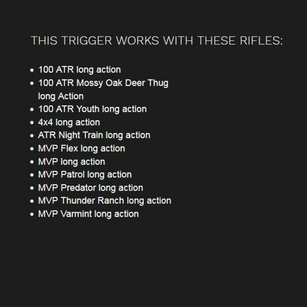 Mossberg 100 ATR Long Action Rep.Büchse, Abzug mit Sicherung schwarz 3lbs/1.362gramm ab Werk, einstellbar von 1,5lbs/681gramm bis 4lbs/1.816gramm, Code 610 Timney USA. Nacharbeiten sind in der Regel nicht erforderlich - eine fachgerechte Montage wird empfohlen!