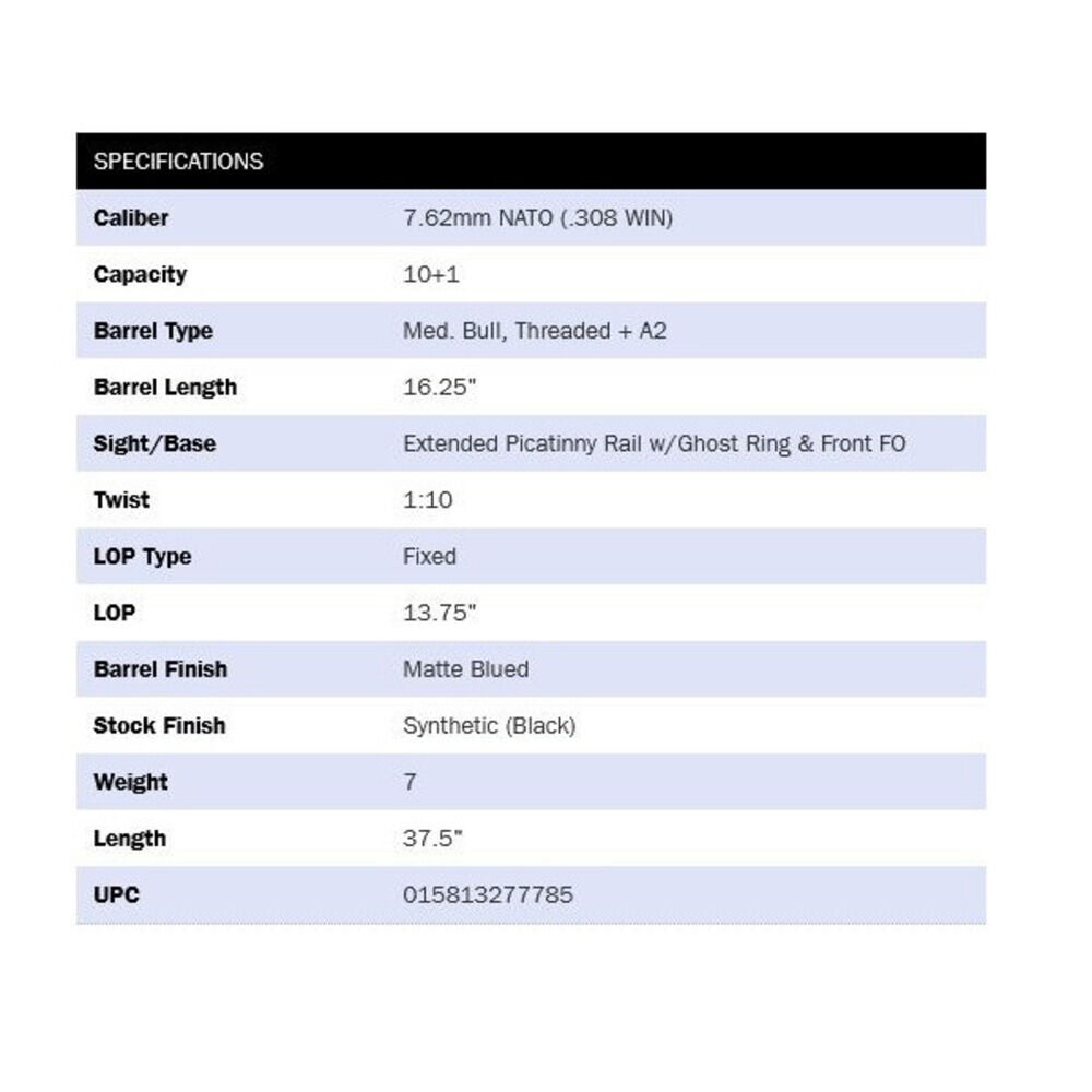 Kaliber .308Win, Rep.Büchse/Rifle MVP Scout 10+1 Patronen matt brüniert, Lauf 16,25"/42cm mit dickem Laufprofil/Medium Bull Barrel, Mündungsgewinde 5/8x24" mit Mündungsfeuerdämpfer A2-Style und Gewindeschutzkappe, die meisten AR Magazine können verwendet werden, Visierung Ghost Ring mit Fiber Visierkorn rot, LBA® Abzug verstellbar von 3lbs/1.362gramm bis 7lbs/3.178gramm, montierte lange Picatinny Schiene 11"/28cm für die Montage von Zielfernrohren mit langem oder kurzem Augenabstand geeignet, Synthetik Schaft Pillar gebettet schwarz und 2/zwei vorne seitlich montierten Top-Rails Picatinny, 1/ein Magazin 10 Patronen, Gewicht 7lbs/3.178gramm, Gesamtlänge 37,5"/95,25cm, Code 27778 Mossberg USA.
