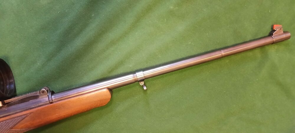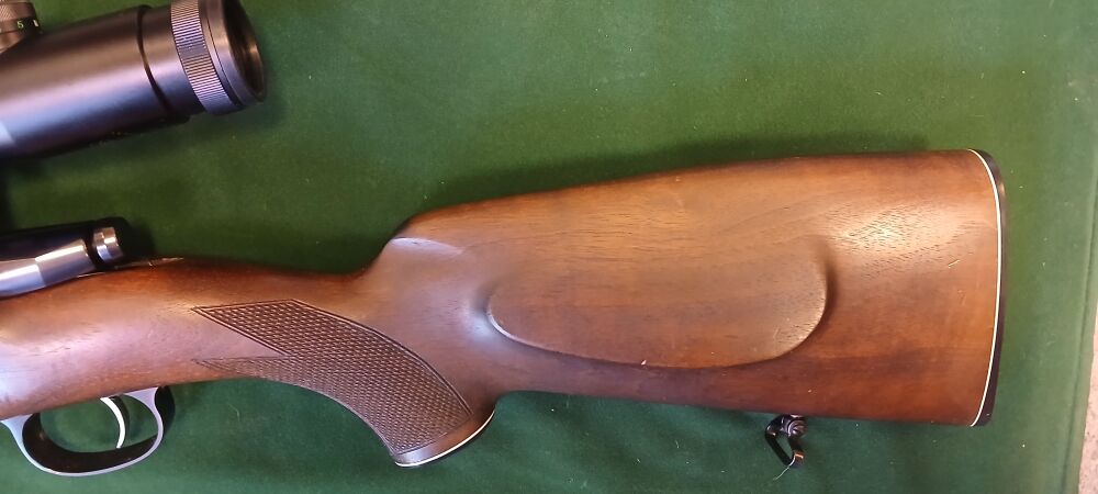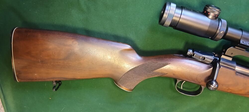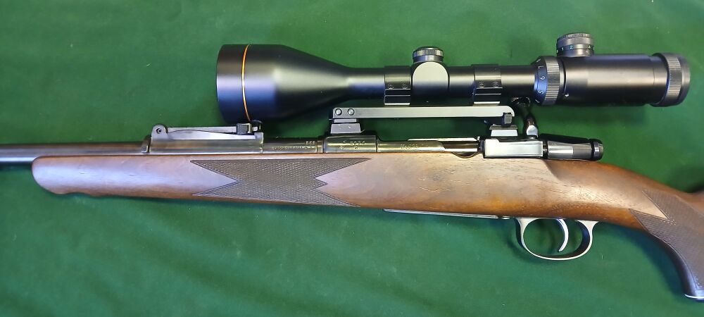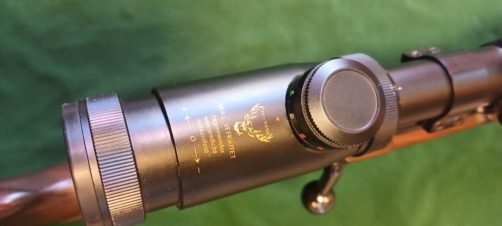 98er System mit militärischem Stufenlauf umgebaut auf jagdliche Verwendung mit sehr feinem Druckpunktabzug und HANDSPANNSYSTEM statt Sicherung !!!, Schwenkmontage mit ZFR Seeadler 3-9x56 "Jägermeister" - Leuchtabsehen, der Rohrkörper am Objektiv wurde etwas angeschliffen wegen der Kimme, Magazinkapazität: 5 Schuß