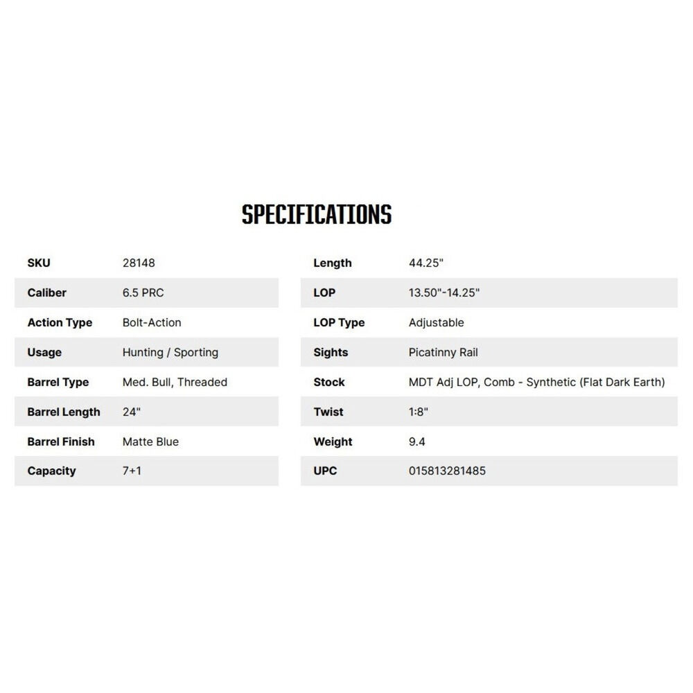Kaliber 6,5mmPRC, Rep.Büchse Patriot LR-Long Range Tactical 7+1 Patronen, Med.Bull Lauf Länge 24"/61cm mit Mündungsgewinde 5/8x24TPI, MDT Schaft mit massiver V-Block Bettung und M-LOK Aufnahmen,Schaftlänge und Wangenauflage verstellbar, entnehmbares 7/sieben Patronen Magazin nach AICS-Standard, Picatinny Montageschiene mit 20 MOA Vorneigung, Schäftung in Sandfarbe FDE matt mit schwarzer Kontrasteinlage am Griff, Lauf schwarz matt, Patented LBA® Abzug verstellbar 2lbs/908gramm bis 7lbs/3.178gramm, Gesamtlänge 44,25"/112,4cm, Gesamtgewicht 9,4lbs/4.268gramm ohne Munition, Code 28148 Mossberg USA.