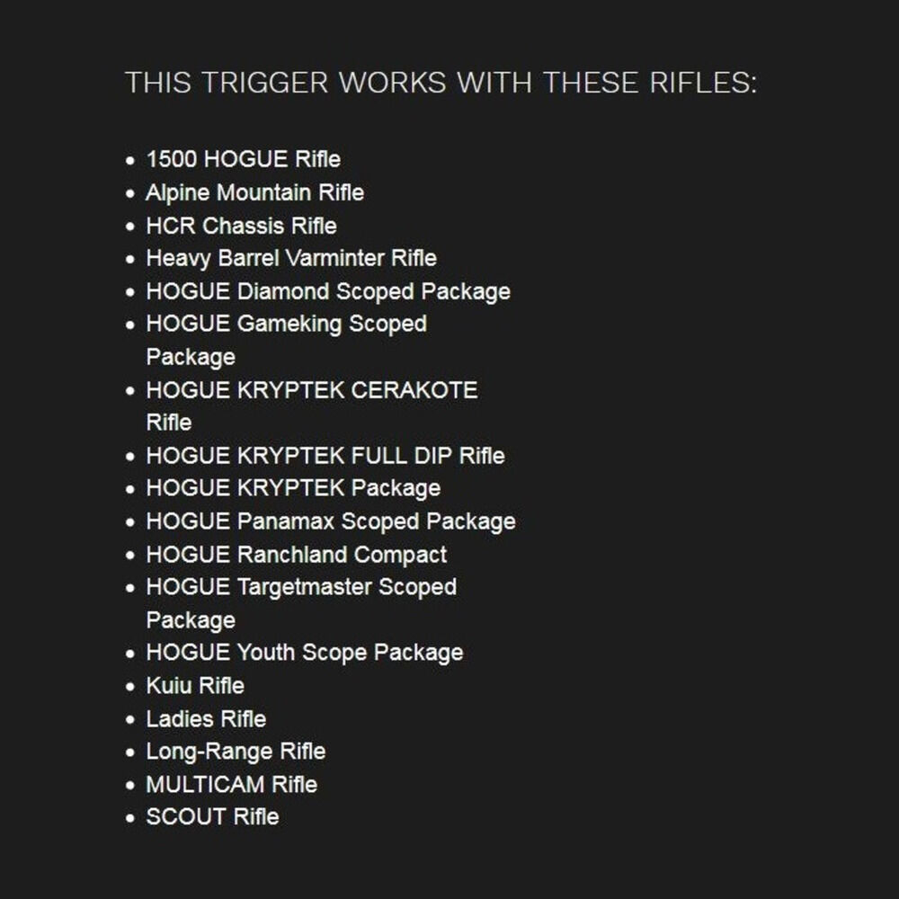Rep.Büchse/Rifle 2-Position Safety Howa Modell 1500, Hogue 1500 Rifle und/oder Weatherby Vanguard, 1-Wege/1-Stage Abzug mit Sicherung 2-Position Solid gebogen schwarz mit 3lbs/1.362gramm ab Werk eingestellt, Abzugsgewicht verstellbar von 1,5lbs/681gramm bis 4lbs/1.816gramm, Code 609 Timney USA. Nacharbeiten sind in der Regel nicht erforderlich - Eine fachgerechte Montage wird empfohlen!