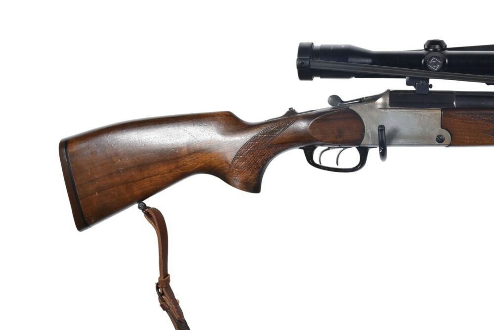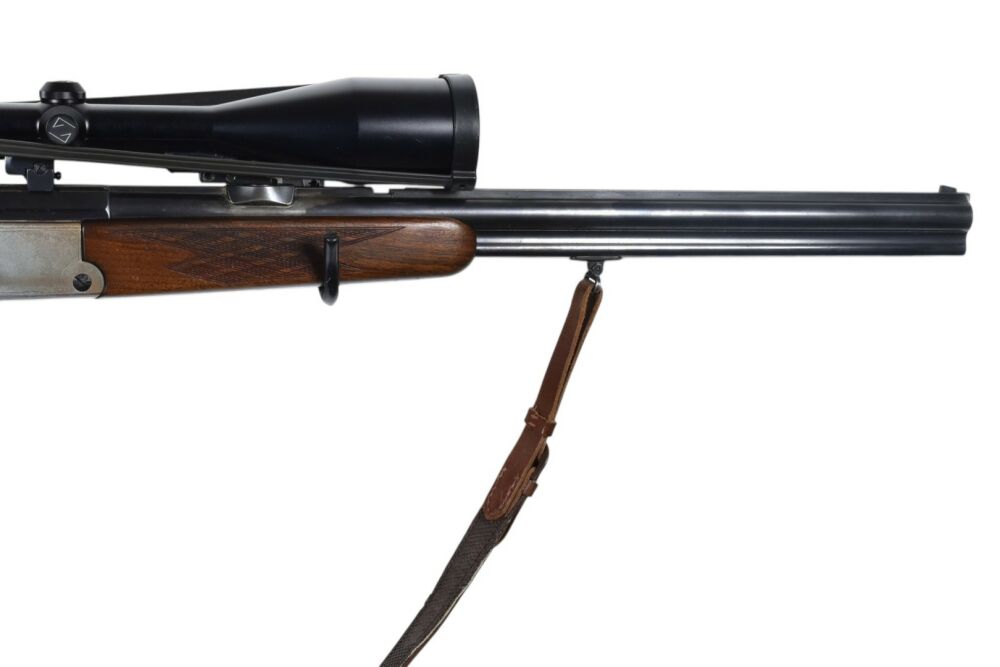 Diese Blaser Mod. ES80 Bockbüchsflinte im Kaliber 7x65R und 12/70 hat eine Gesamtlänge von 101 cm, eine Lauflänge von 60,5 cm sowie eine Schaftlänge von 35 cm. Die kombinierte Waffe ist mit einem Zeiss Diatal 8x56 mit Absehen 1 ausgestattet. Ein Riemen ist montiert.